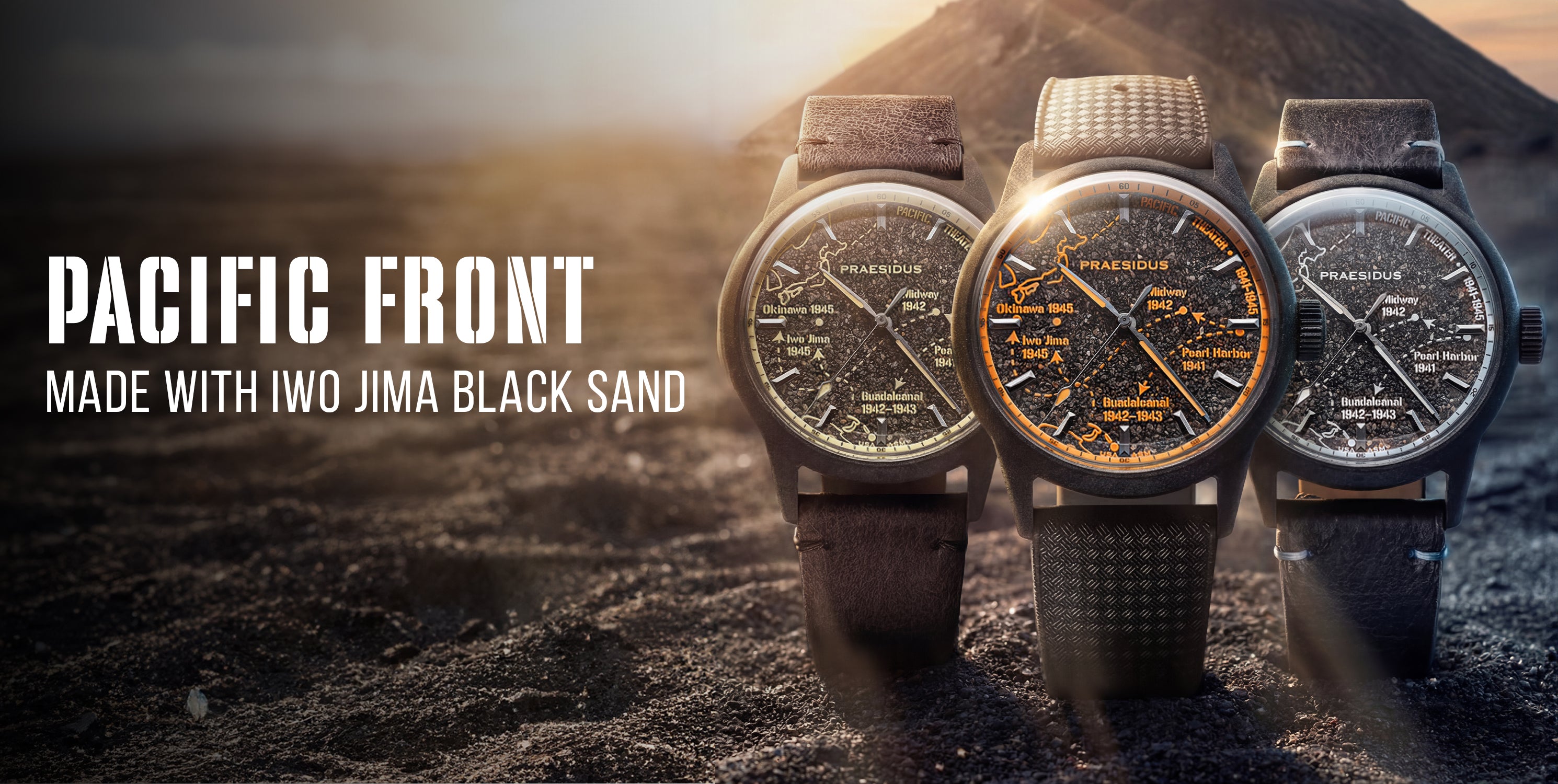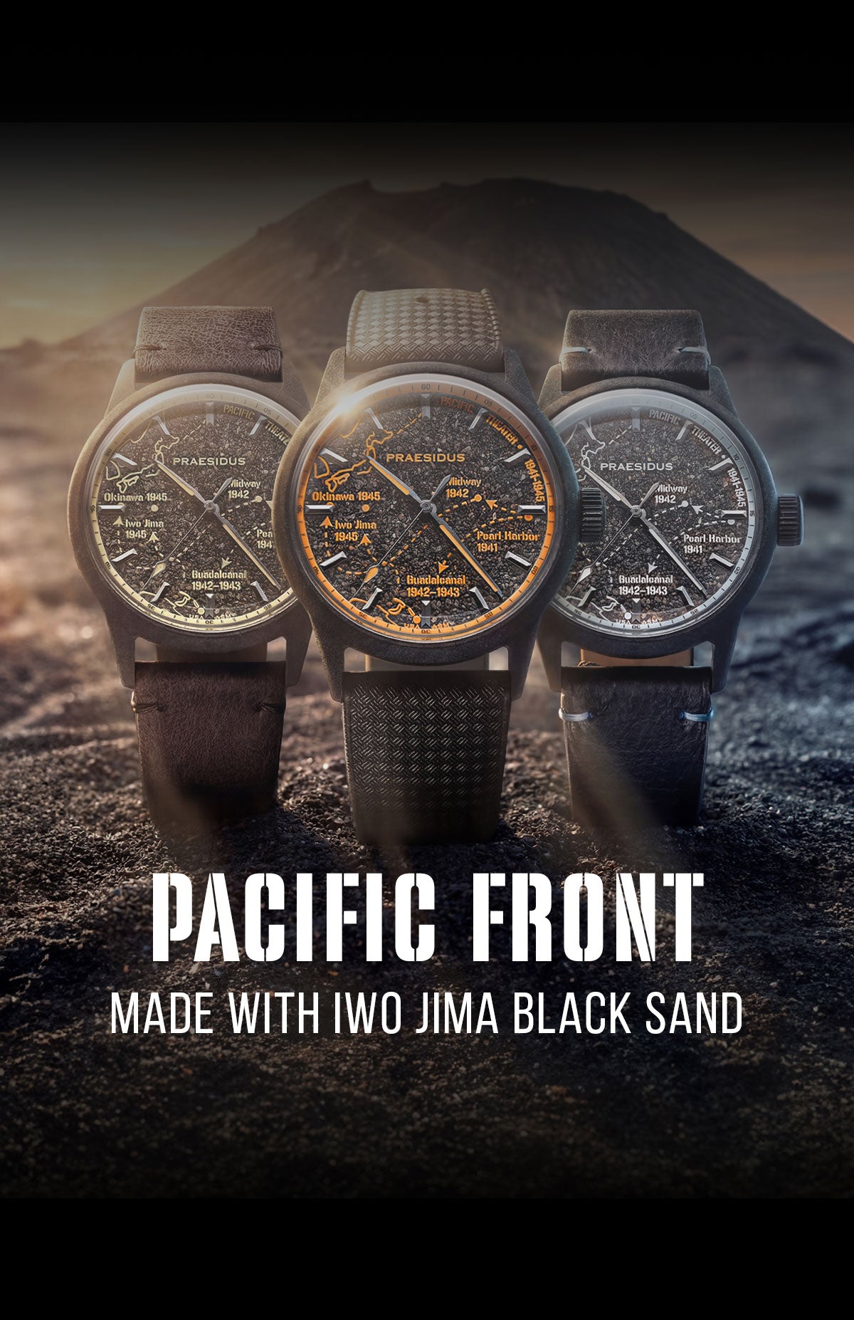 The A-11 Pacific Front – Volcanic Orange commemorates the scale and reach of the Pacific Campaign through material and form. The frosted black dial is infused with authentic volcanic sand from Iwo Jima, anchoring the watch in one of the most decisive landscapes of the theater.