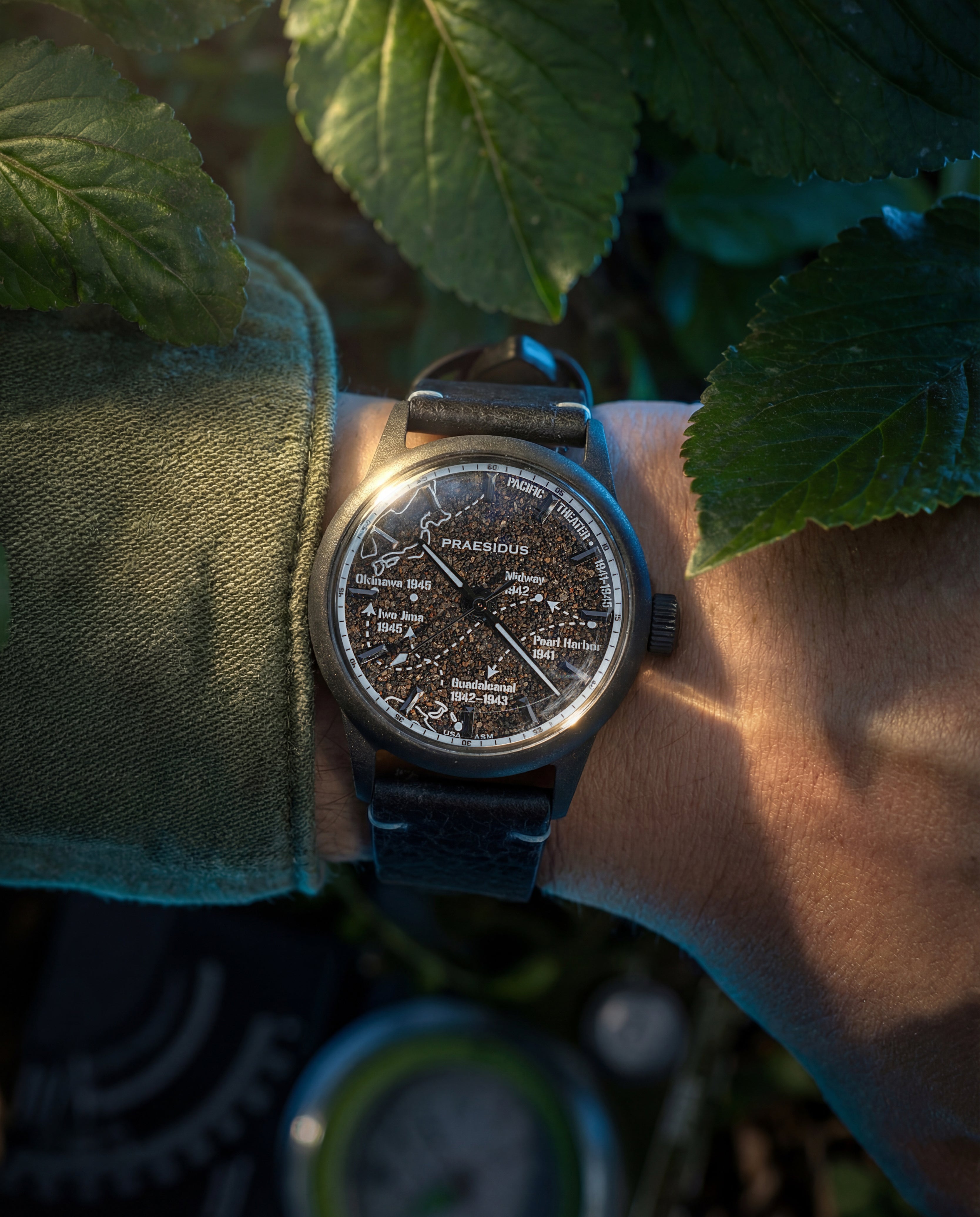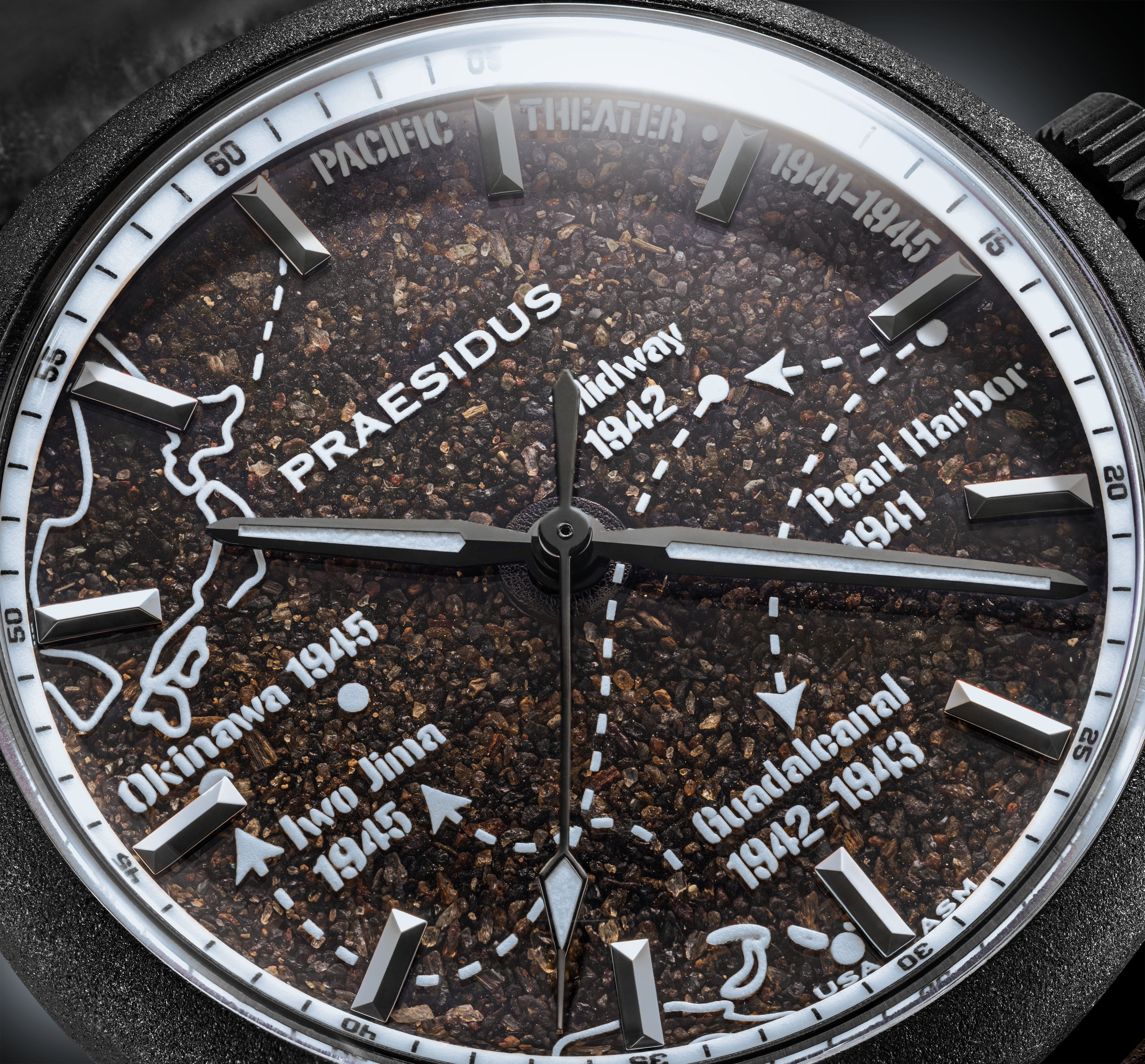 The A-11 Pacific Front - Abyss Blue commemorates the scale and reach of the Pacific Campaign through a cool, depth-focused execution. The frosted black dial is infused with authentic volcanic sand from Iwo Jima, anchoring the watch in one of the most decisive environments of the theater.