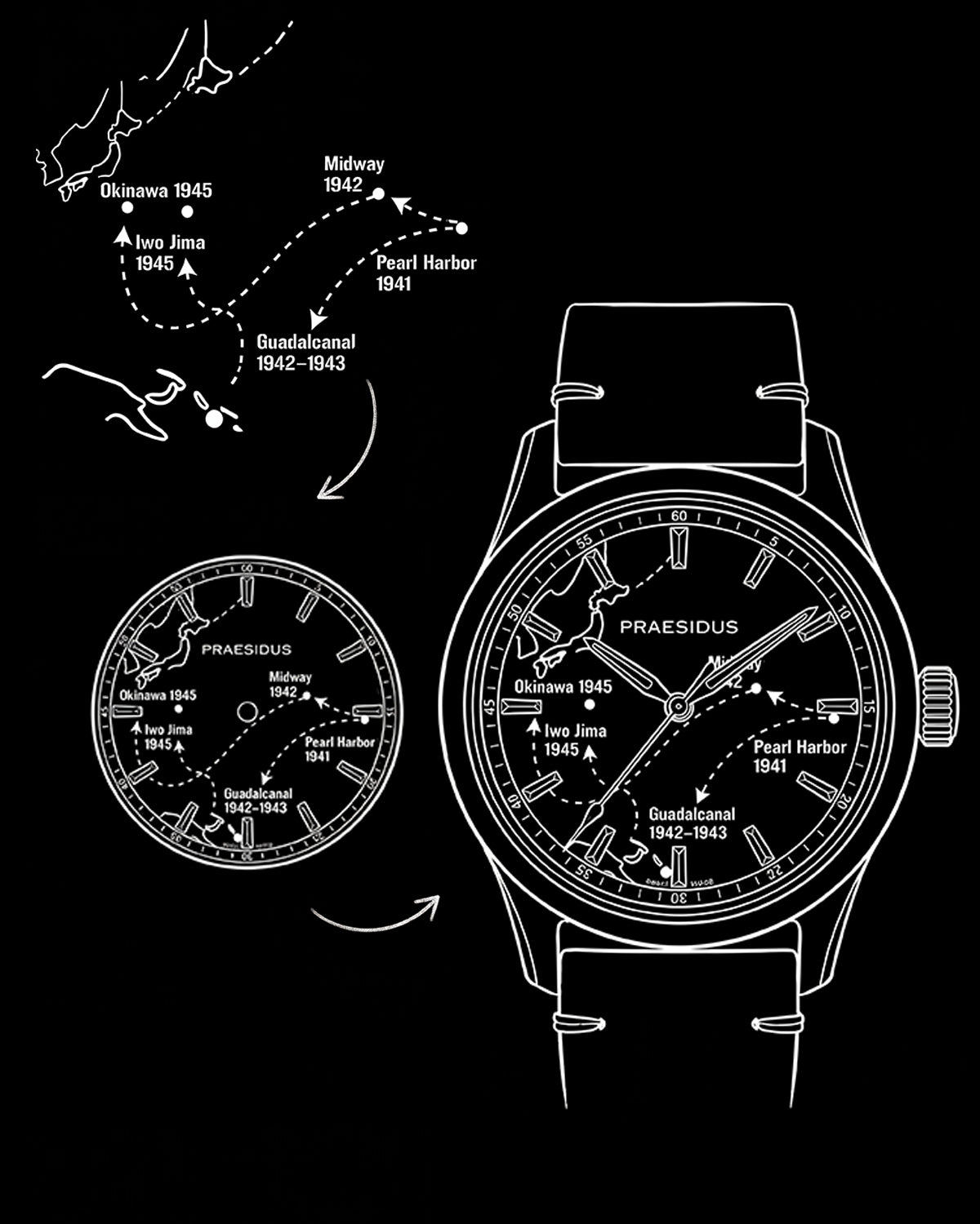 A transparent overlay features a Pacific Theater map rendered in Abyss Blue, referencing the vast naval distances and open-water operations that defined the campaign. The case follows original A-11 Field Watch proportions and is paired with a black tropic rubber strap for durability and everyday wear.