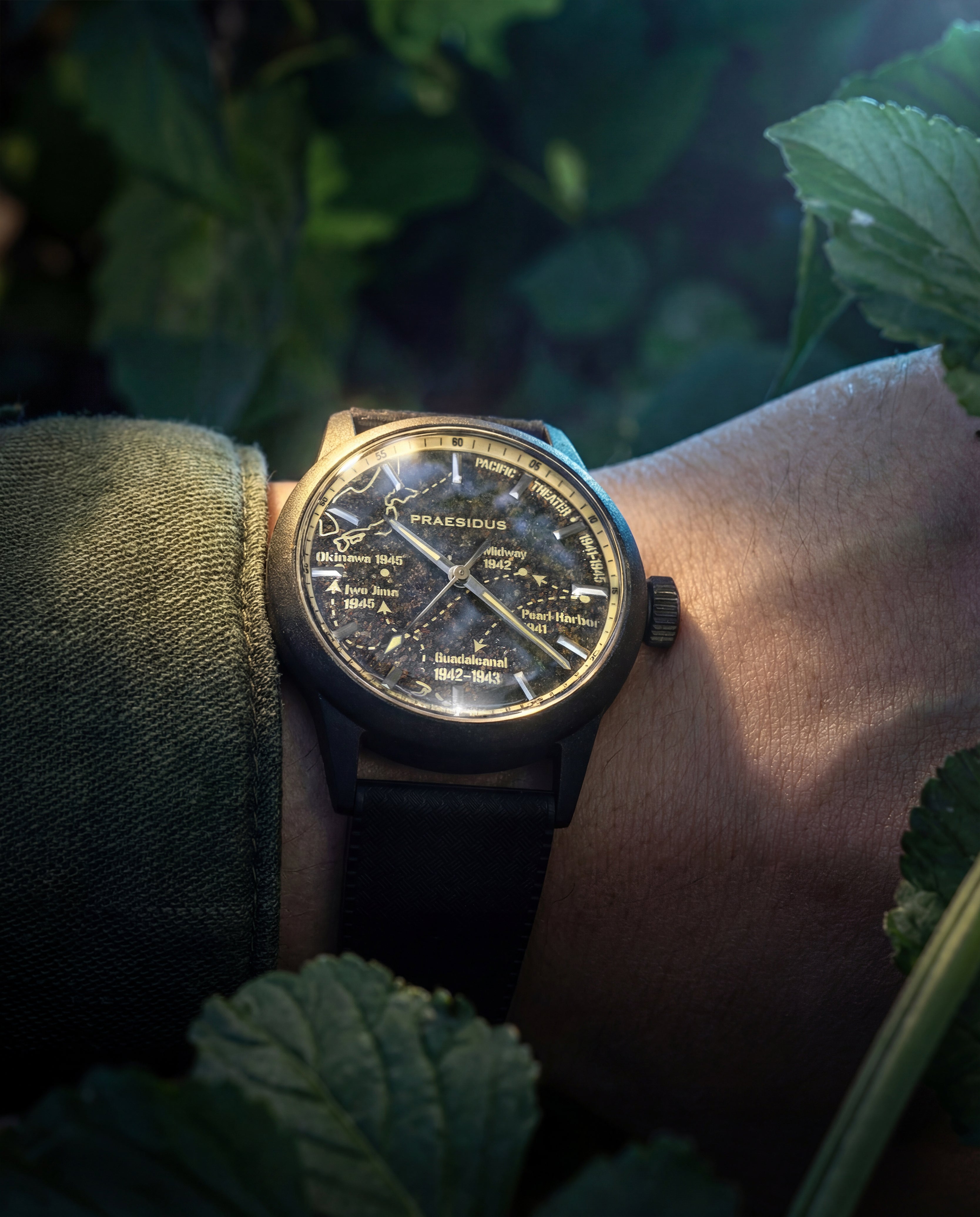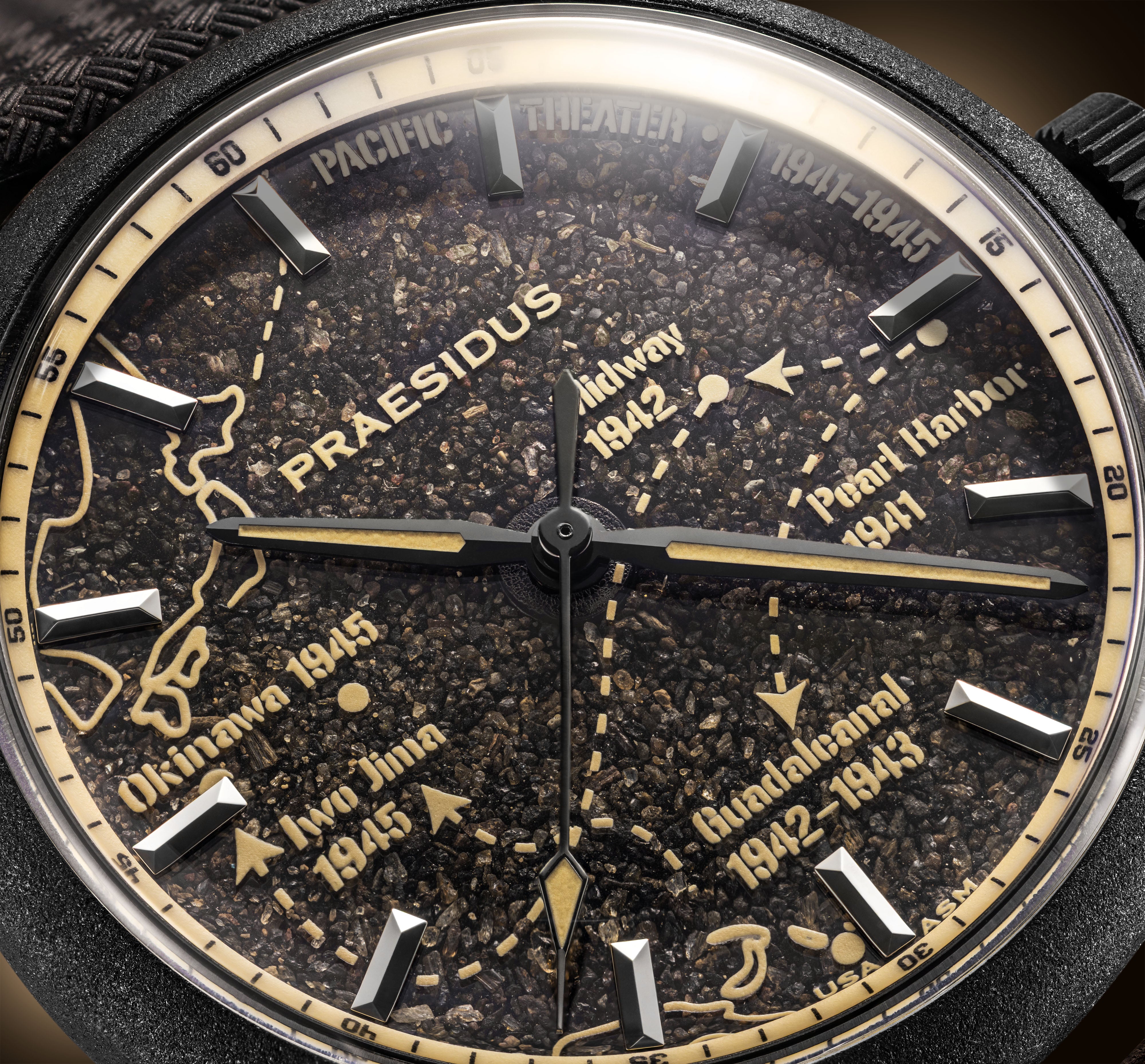 The A-11 Pacific Front - Patina commemorates the scale and endurance of the Pacific Campaign through a more restrained, aged execution. The frosted black dial is infused with authentic volcanic sand from Iwo Jima, grounding the watch in one of the campaign’s most decisive landscapes.