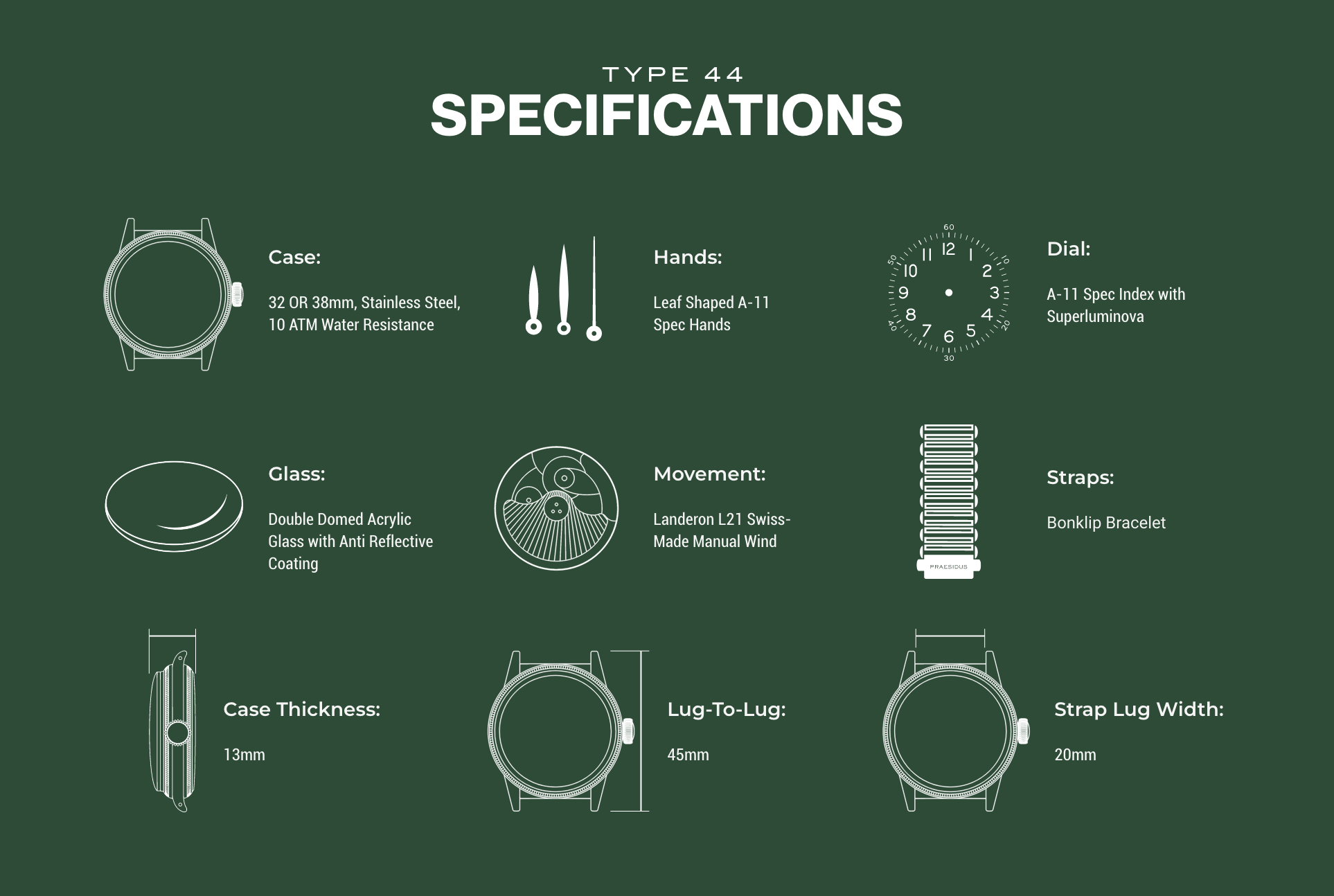 So if you're looking for an A-11 that you can actually wear without risk & that truly incarnates the incredible American ingenuity & bravery of the men behind the originals, the A-11 Type 44 is for you. Seeped in American history, you can choose from the ultra authentic 32mm to the more modern 38mm. Featuring a 1940s style Bonklip Bracelet, the Type 44 truly is a 1940s revival ready for the 21st Century.