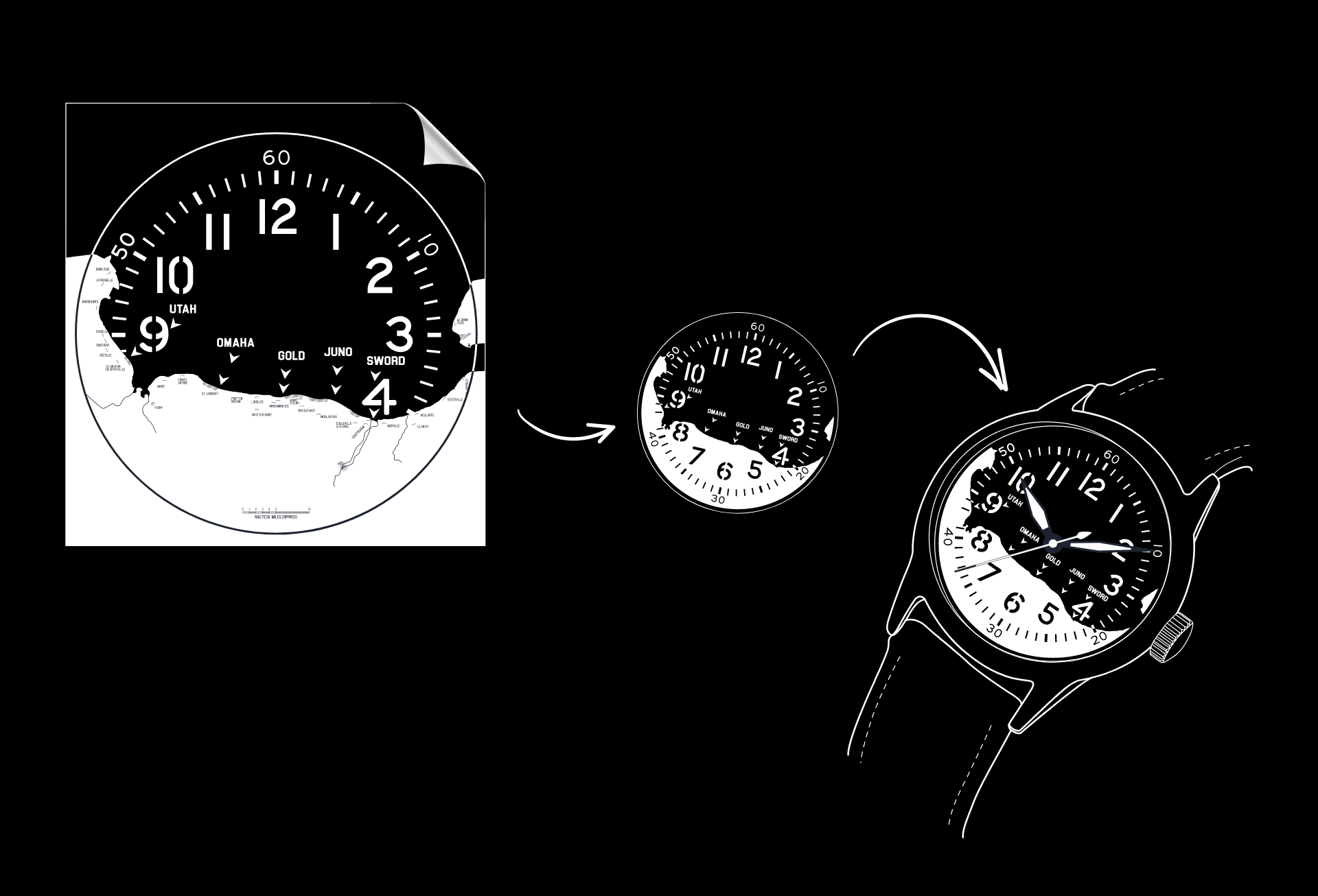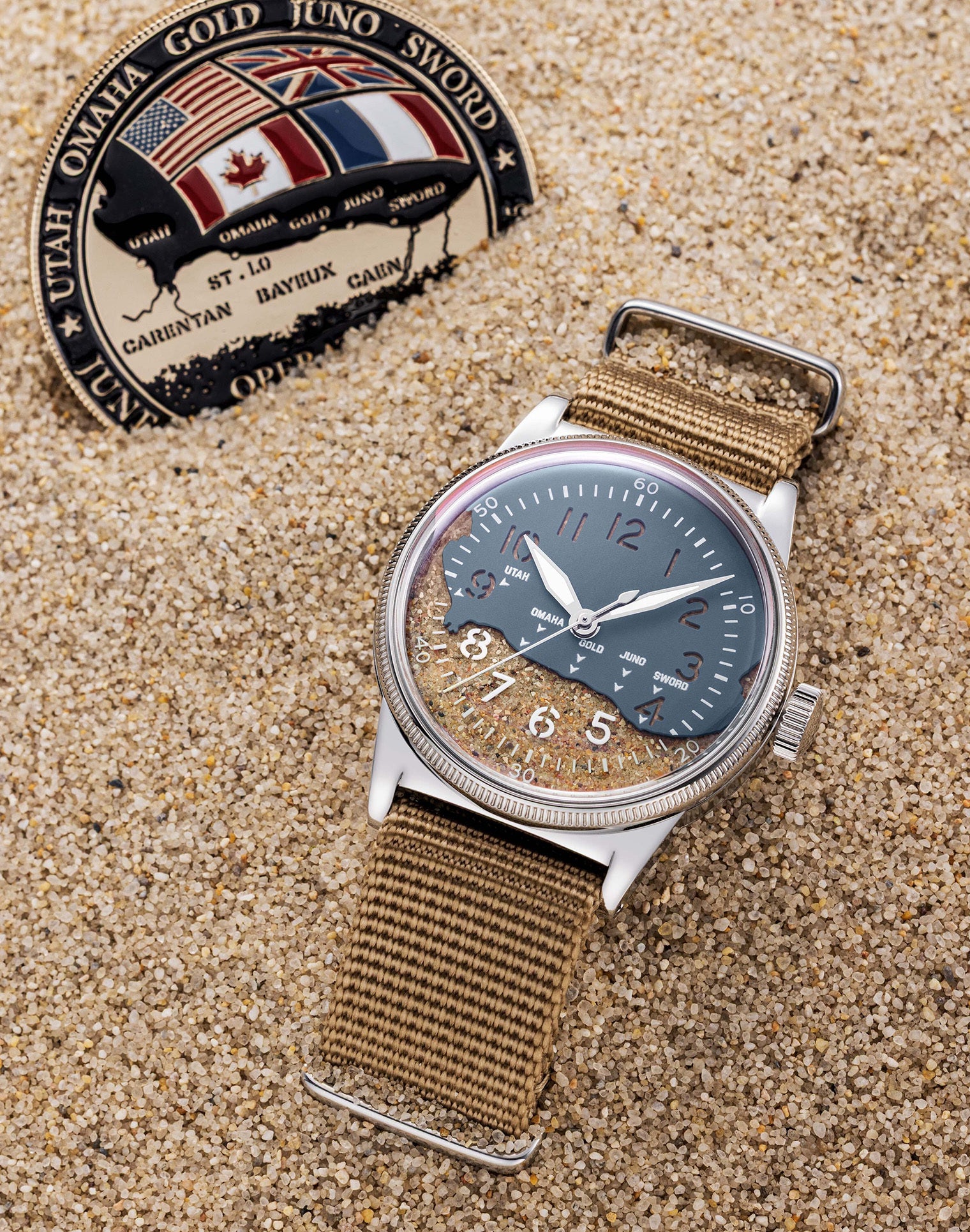 The cutout on the upper dial is shaped to mirror the coastline of Normandy, where the five original D-Day landing beaches—UTAH, OMAHA, GOLD, JUNO, and SWORD—were located. Each landing site is marked precisely on the dial, providing a detailed visual tribute to the operation.