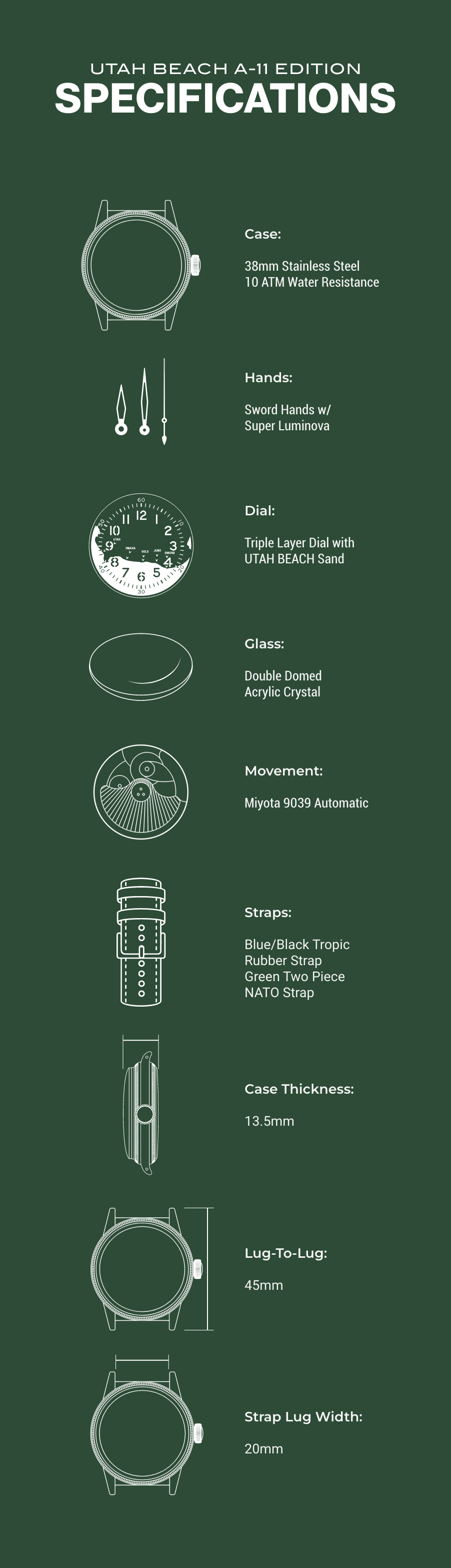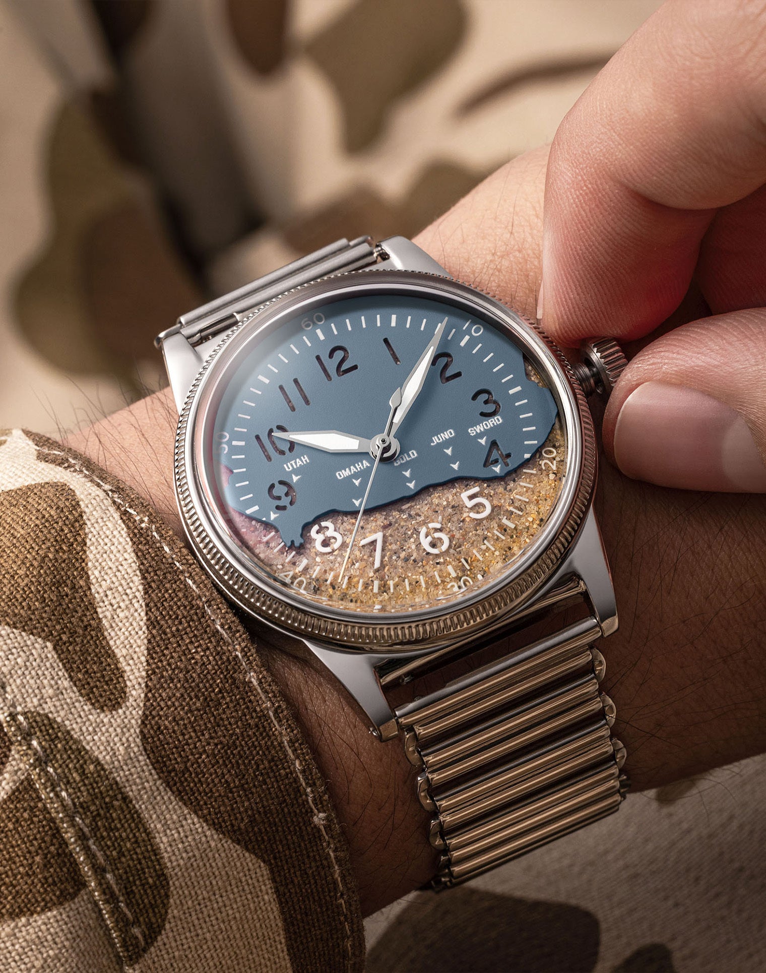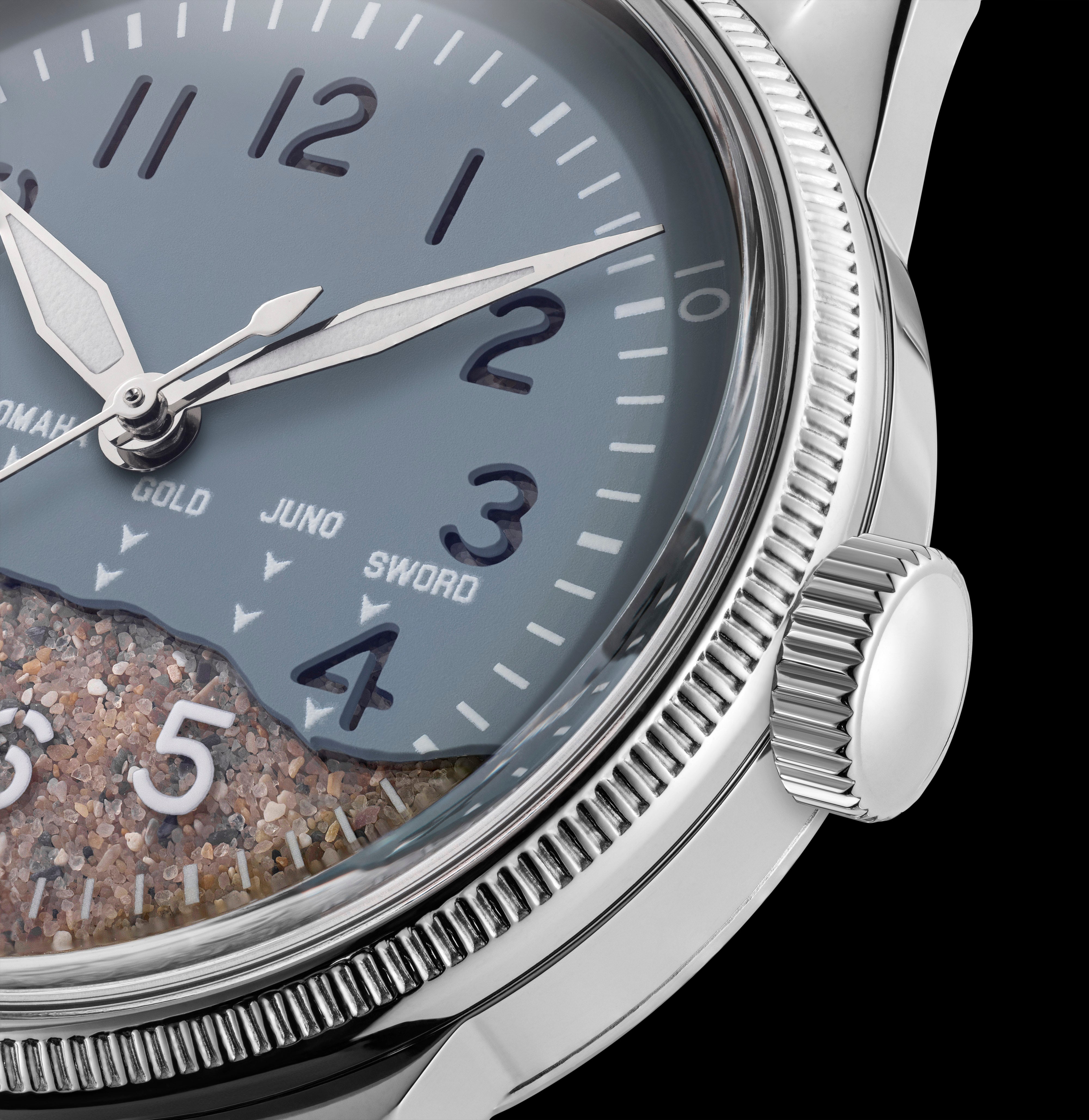 The A-11 Utah Beach MK2 - Higgins Blue was developed as a unique commemorative piece for the 81st Anniversary of D-Day, following overwhelming demand for a reissue of this now-iconic design. The centerpiece of this edition is the “Higgins” Blue dial, made using real sand collected from UTAH BEACH and symbolically representing the broader scope of the D-Day operation.