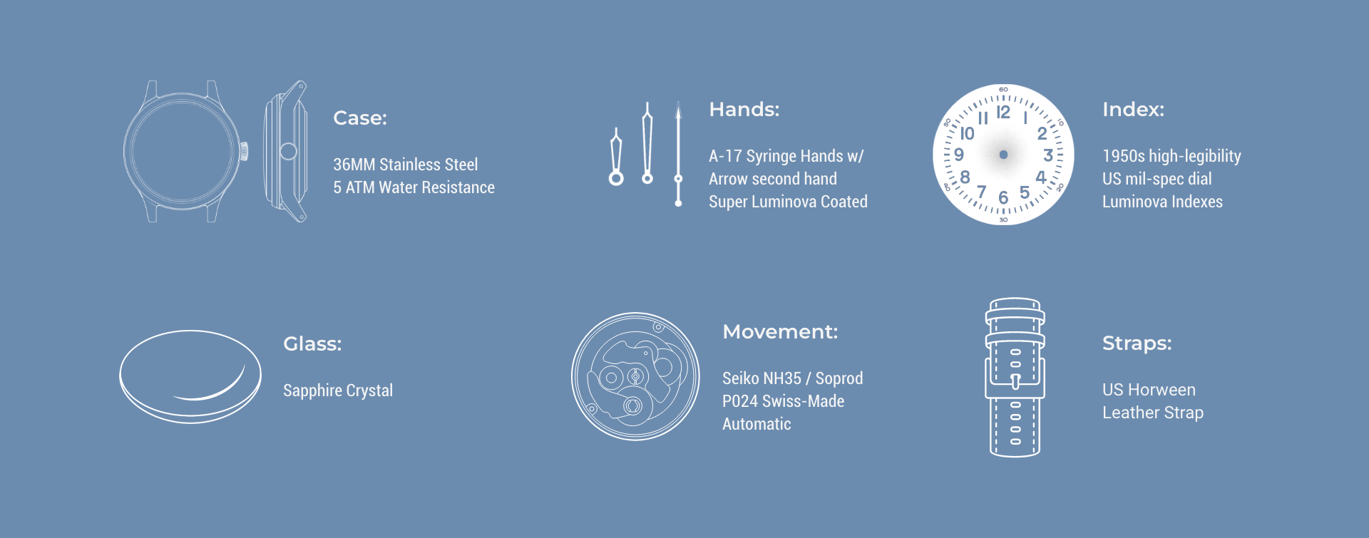 The A-2 Bud & Diz was built with longevity in mind - that is the least we could do given the historical importance of the F4F/P-51 on the caseback. Featuring a 5ATM water-resistance & an industry-leading sapphire crystal, your A-2 will be able to follow your day-to-day with minimal risk. For low-light situations, we’ve lumed the indexes & hands of the A-2 generously.