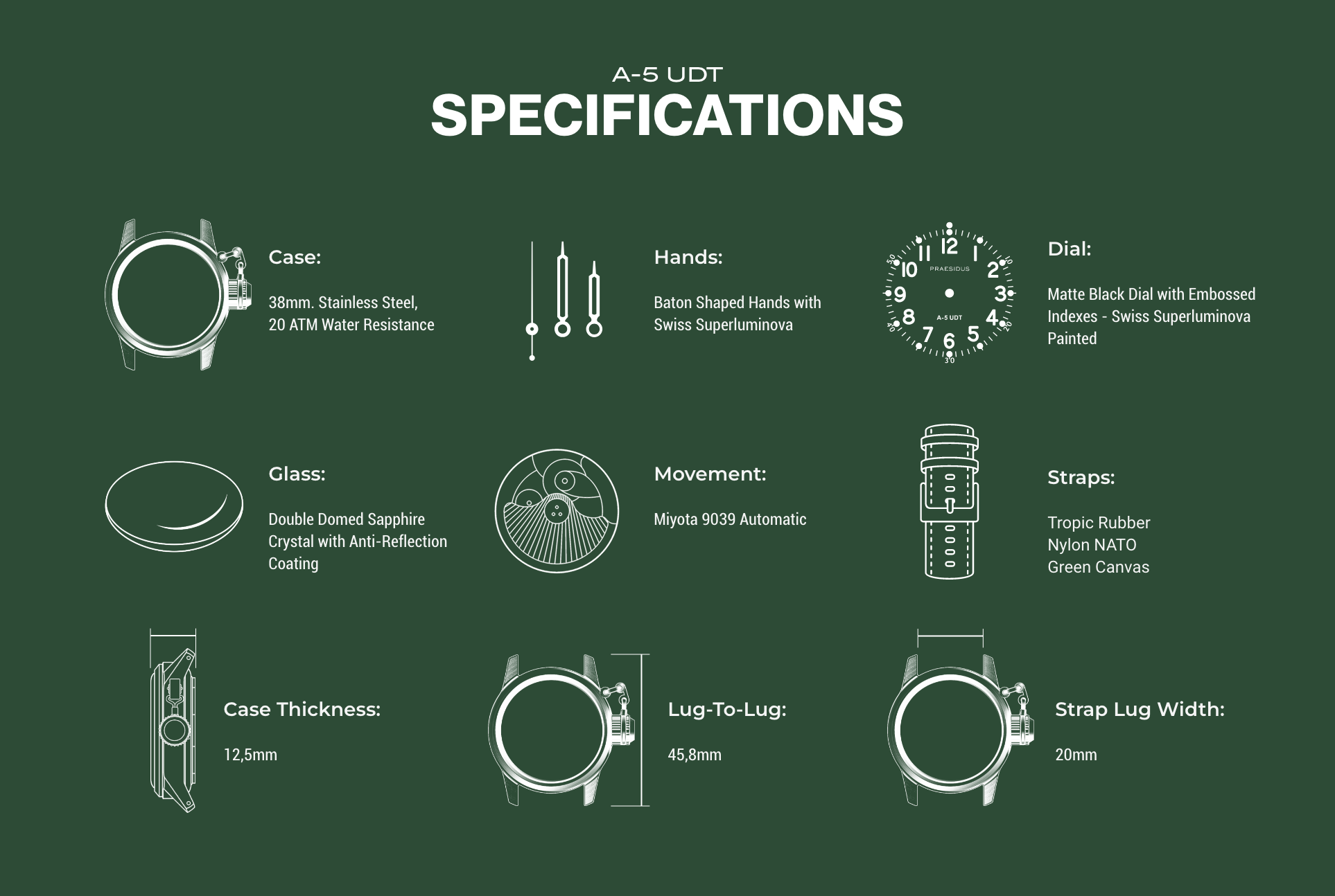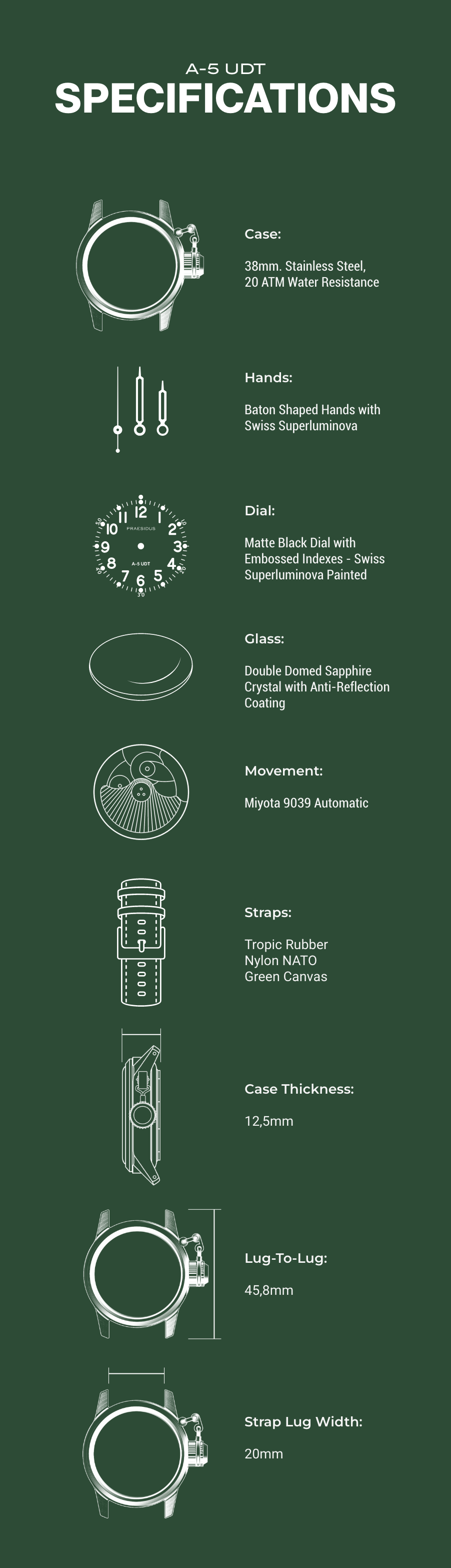 The A-5 UDT was designed to meet an operational need that has existed ever since men could dive: reliable timekeeping underwater. Based off an original USN BUSHIPS design, this dive watch exudes ruggedness with its oversized crown and solid case. During WW2, this system was the only way for Underwater Demolition Teams to safely ensure their watches’ water-resistance during extended dive missions. More than a homage, we’ve truly revived this icon.
