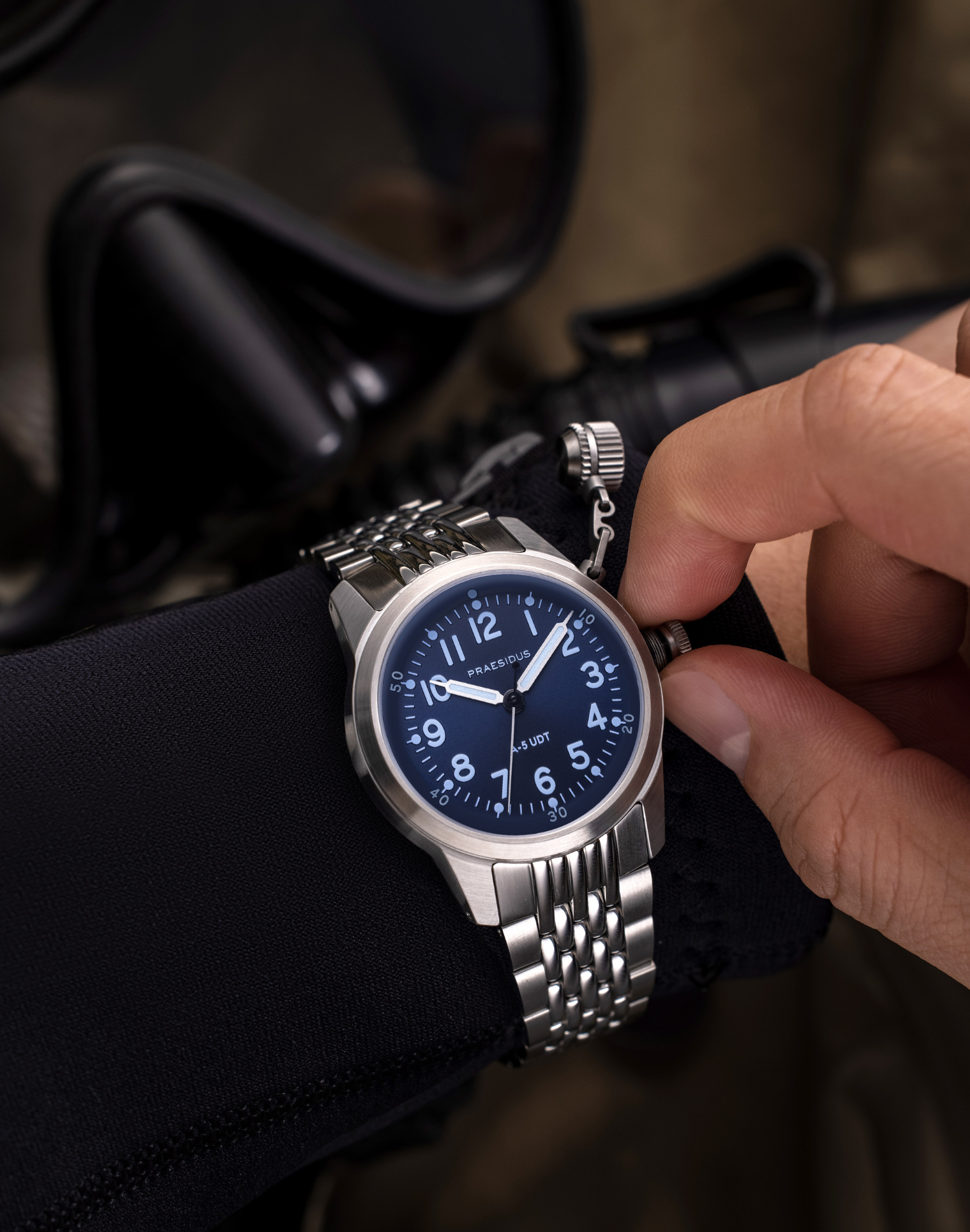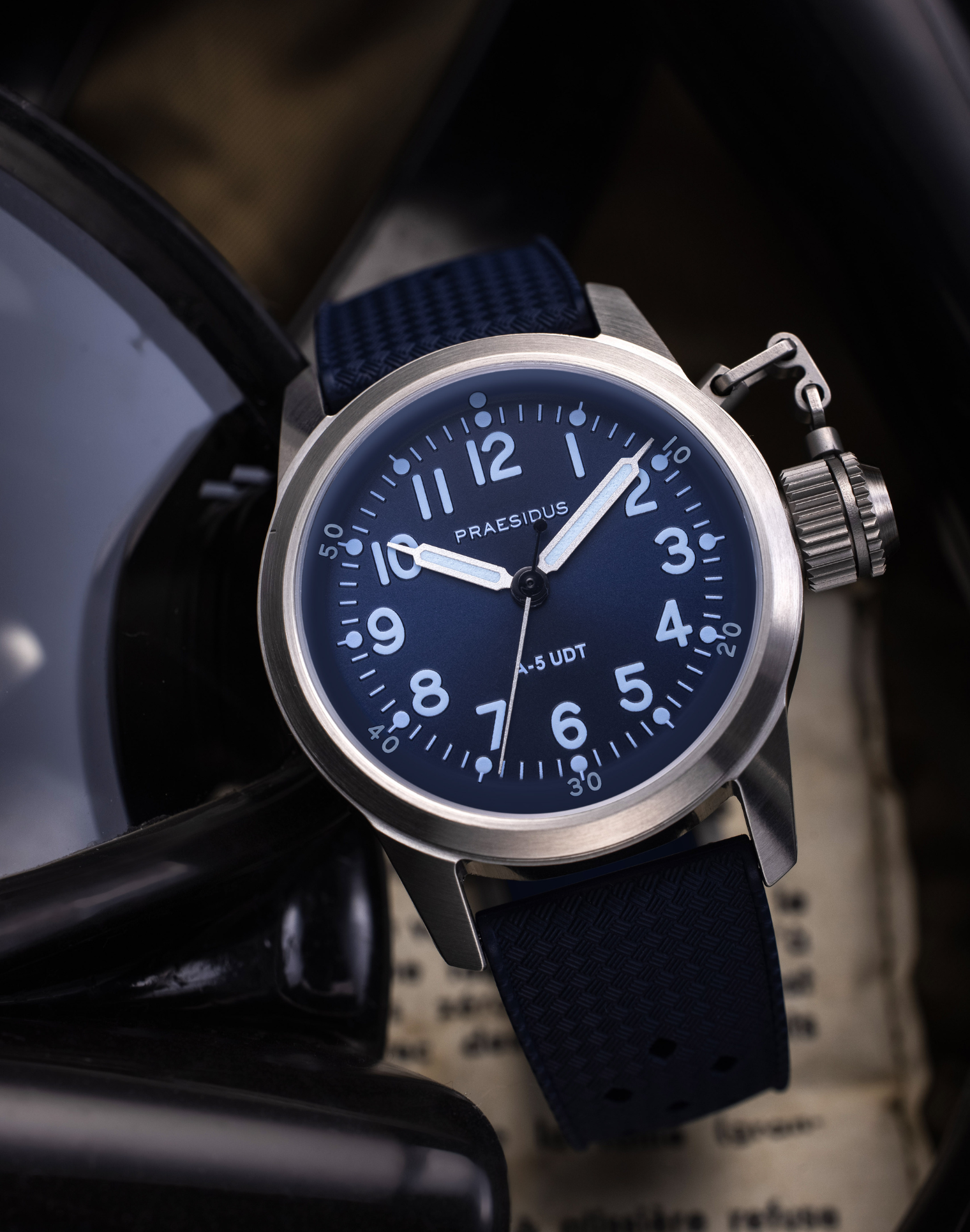 The A-5 UDT was designed to meet an operational need that has existed ever since men could dive: reliable timekeeping underwater. Based off an original USN BUSHIPS design, this dive watch exudes ruggedness with its oversized crown and solid case. During WW2, this system was the only way for Underwater Demolition Teams to safely ensure their watches’ water-resistance during extended dive missions.