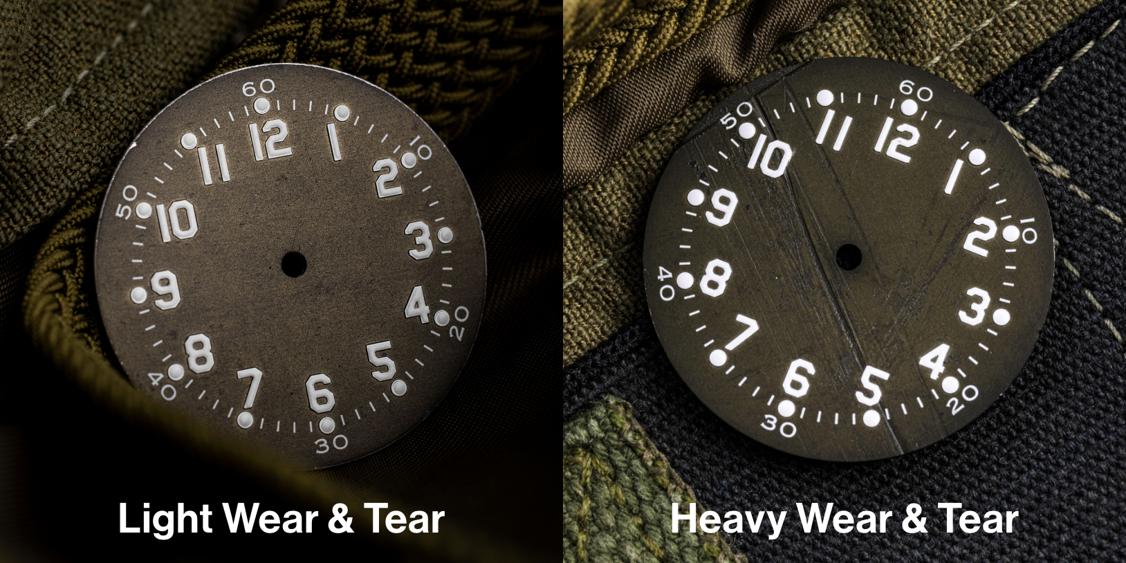 Due to the origin of the dial (taken from a C-47 Hamburger door) each watch will offer a unique patina & scratch pattern. This however, will be muted by the Olive Drab paint that we've added to the dial. The color comes directly from our sampling of the paint color used on C-47s for D-Day.