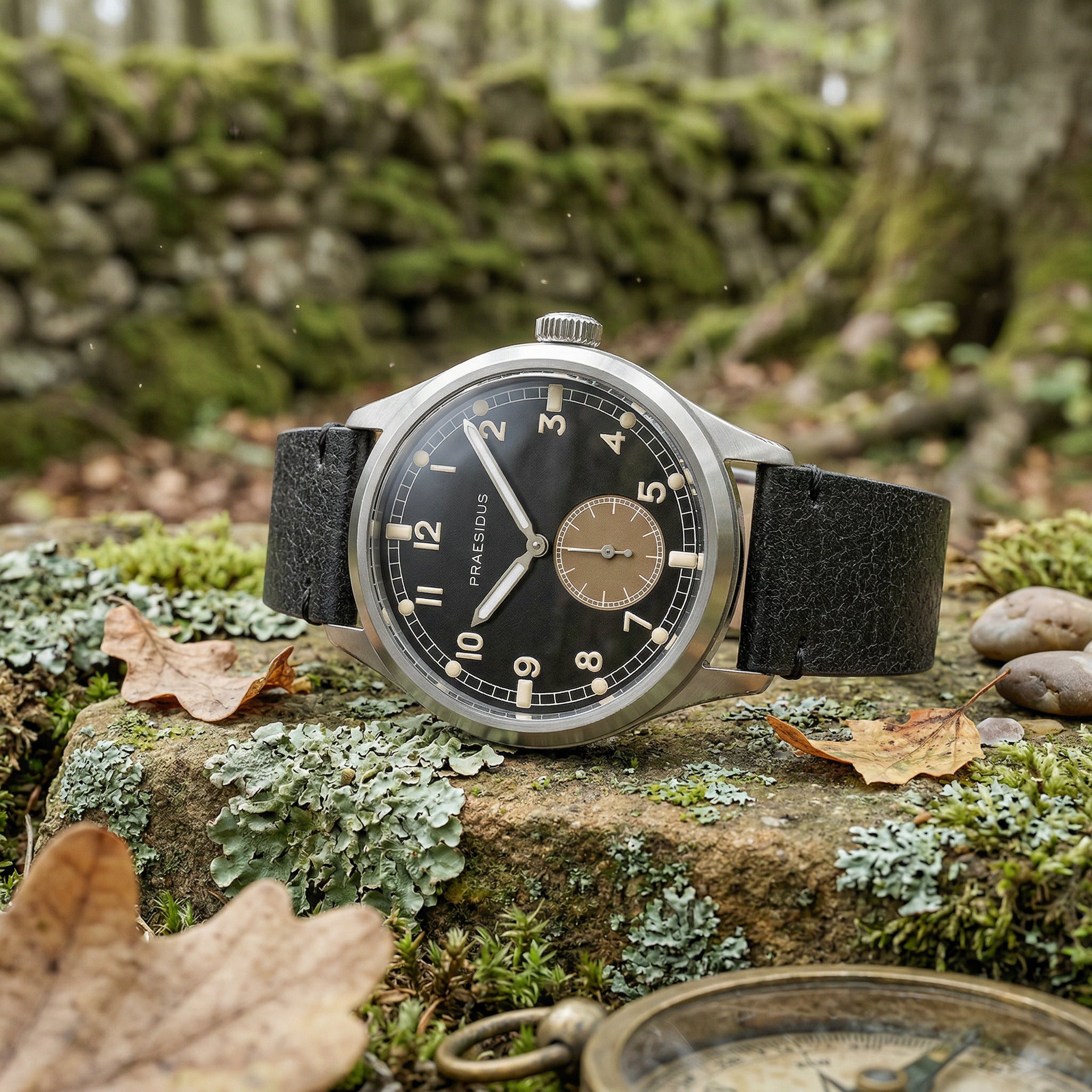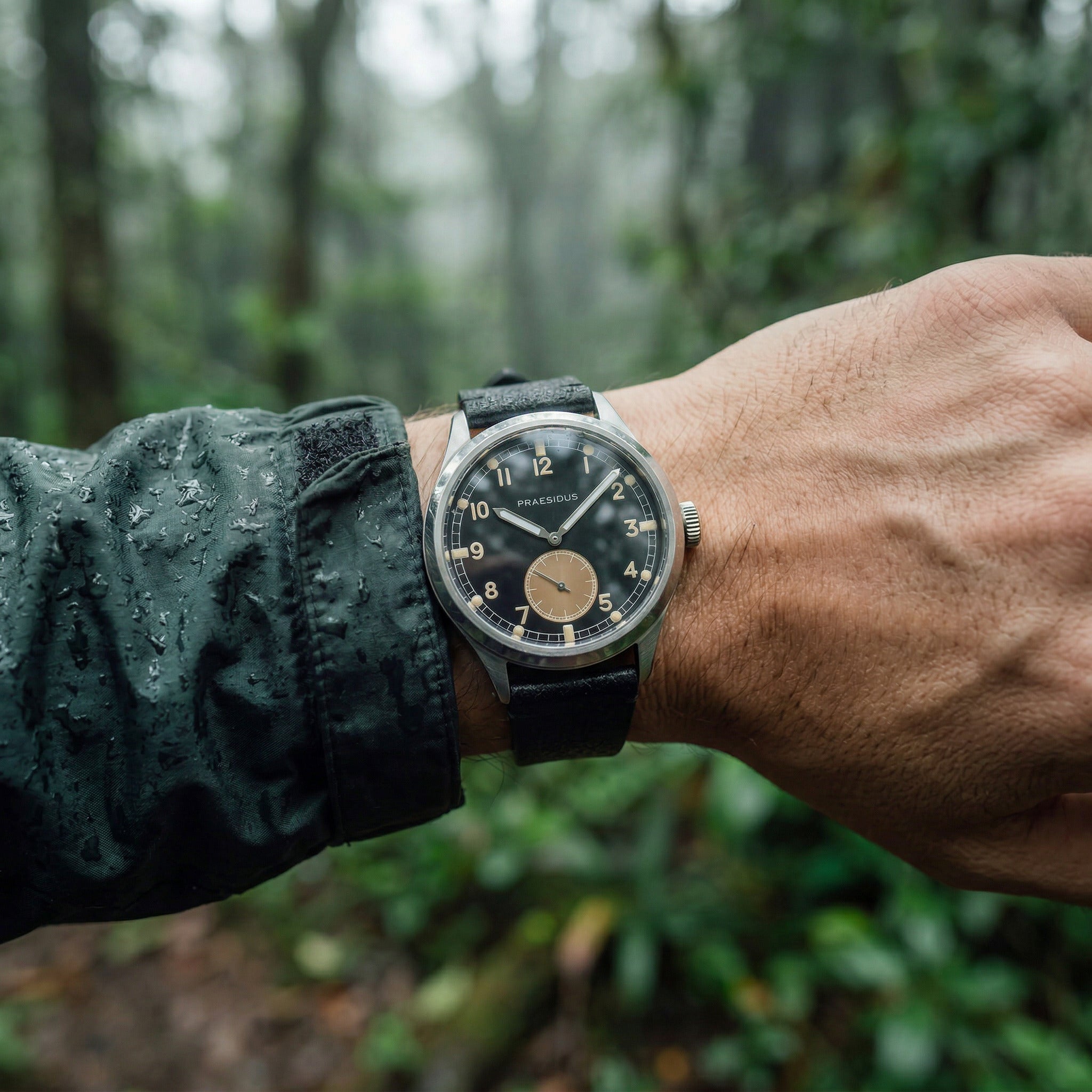 The Praesidus DD-45 preserves that utilitarian layout while upgrading it for modern durability. A screw-down crown and 10 ATM water resistance improve protection in wet environments, while a double-domed sapphire-coated crystal shields the dial from scratches and everyday wear.