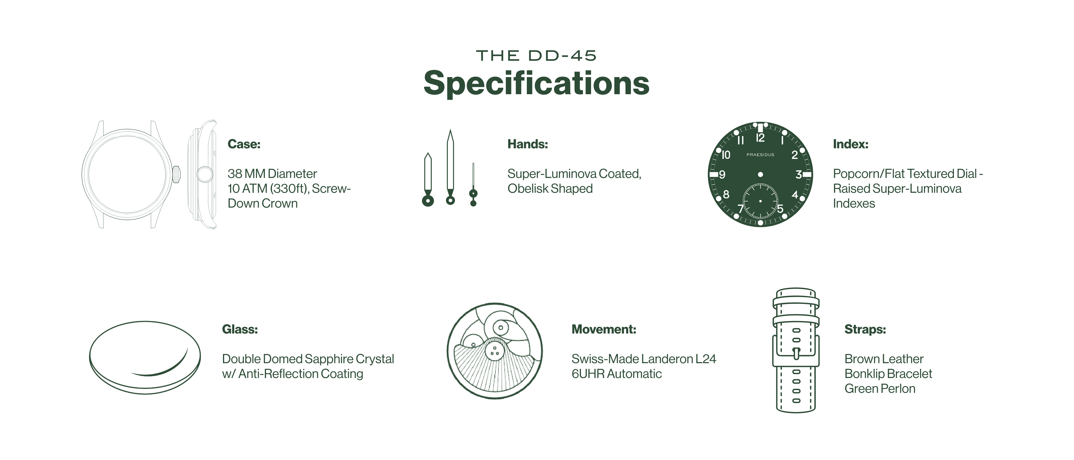 Designed as a homage to the original Dirty Dozen designed for the British War Office to equip the British Army with a standardized high-performance field watch, the DD-45 surpasses the originals spec wise bringing it to the 21st century. Originally meant to be "Waterproof" we've modernized the initial design requirements. The DD-45 comes with 10ATM water resistance & a screw-down crown - helping to keep things safe in wet conditions. The double domed sapphire crystal provides best in-class scratch resistance further improving the longevity of your DD-45.