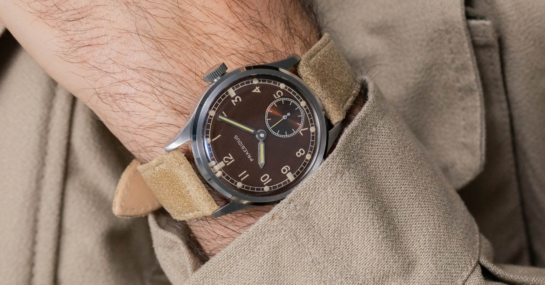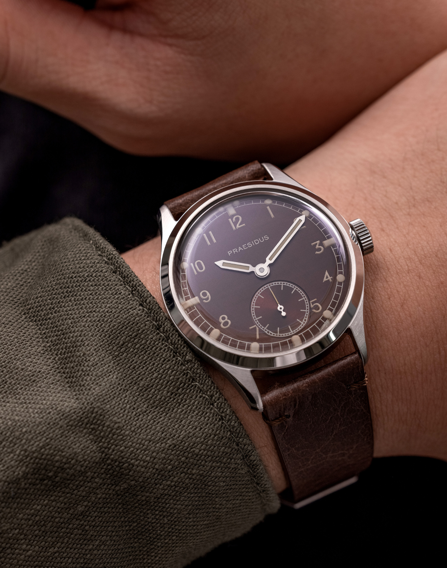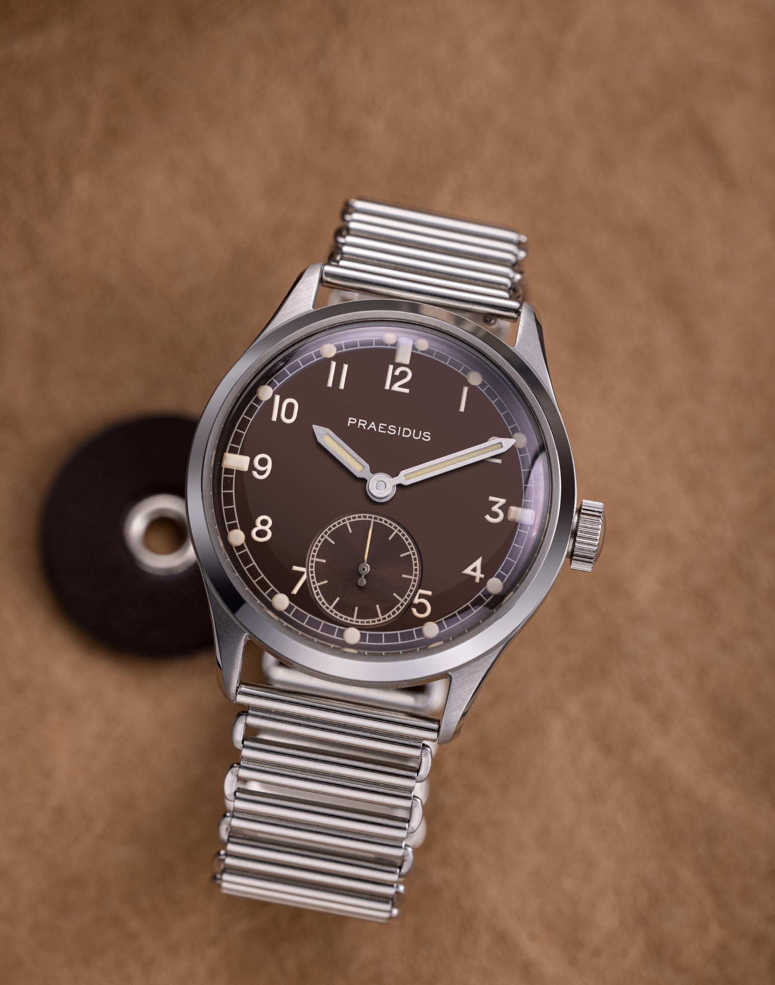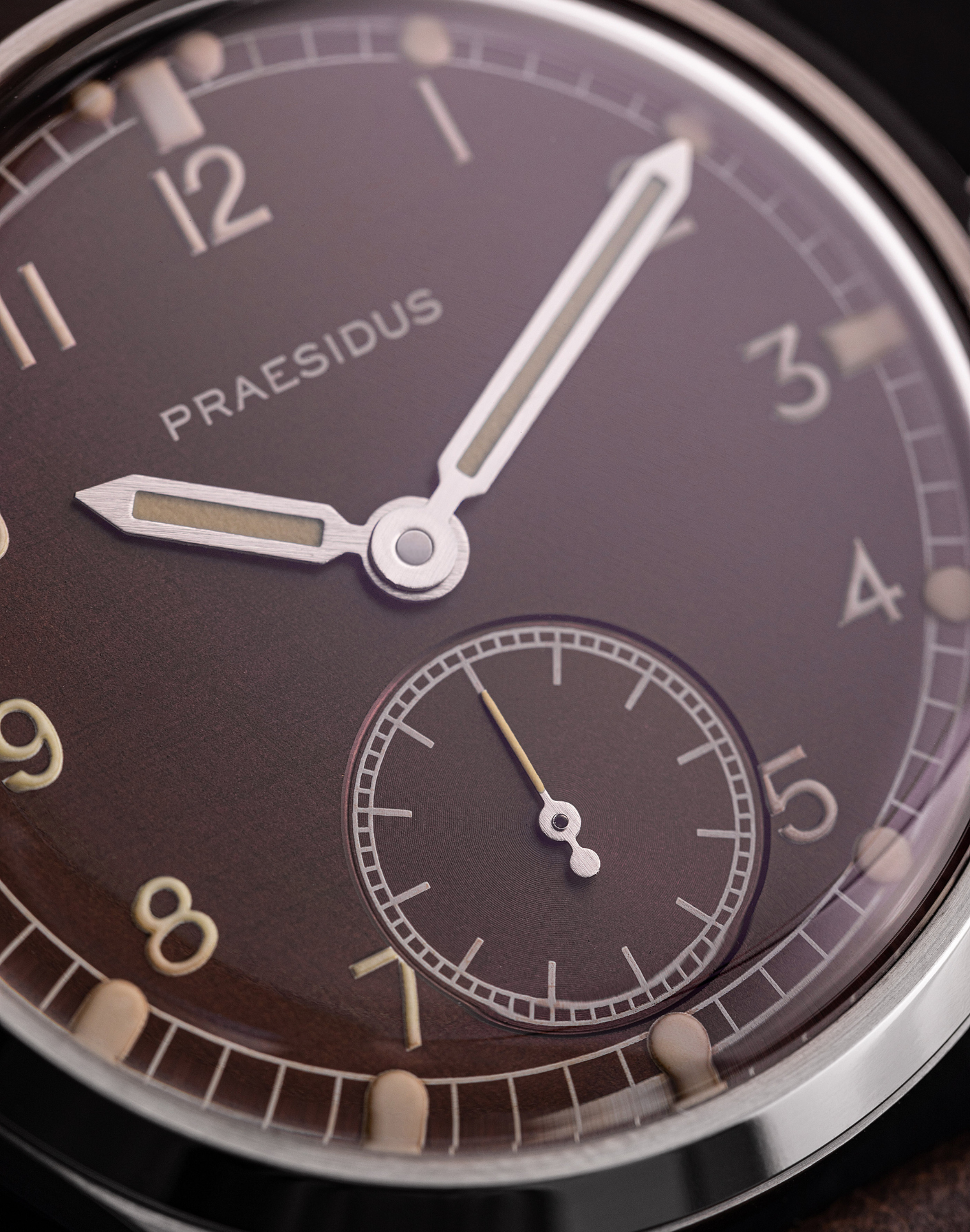 The DD-45 "Tropical" is the result of two years of development with our dial supplier. The deep brown dial coloration combined with the patina indexes & hands is meant to reference a rare kind of aging where the black dial paint used would morph into a dark brown as the watch was exposed to sun & humidity over the years. The result on the DD-45 of our "tropicalization" is a truly unique dial that looks like some rare Dirty Dozens today; 80 years after they were produced. It serves to highlight the true age of the originals and, the wear & tear that they have gone through while being used in the field by actual armed forces.
