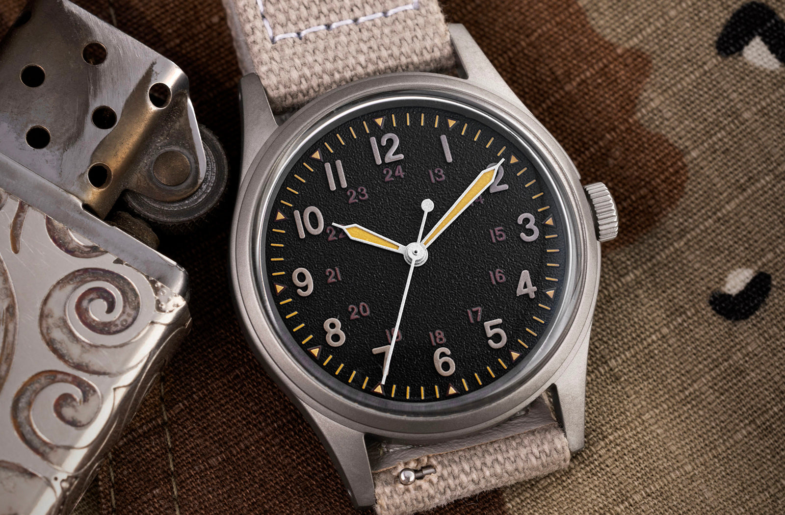 For this limited edition redesign of our iconic Jungle Field - we've taken inspiration from the MERDC & "Chocolate Chip" camouflage pattern developed for use in arid & desert conditions in the 70s & 80s on vehicles. For the Night Black dial we've played on the MERDC camouflage's integration of black with beige & browns to give a more creative interpretation of a Desert Night Dial.