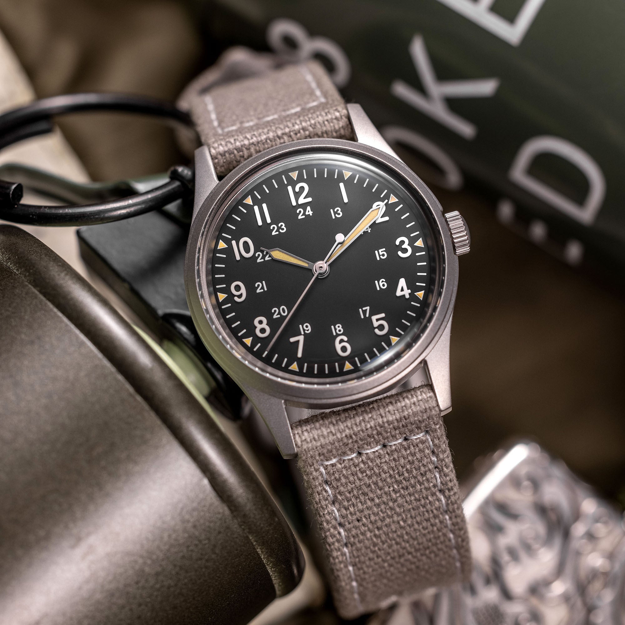 Inspired by the iconic GG-W-113 spec published by the US Military in 1967, the Jungle Field incorporates all key elements to guarantee legibility & reliability. The original GG-W-113 spec was most famously used throughout the Vietnam War by US pilots as a highly dependable tool. We made sure to respect the original specifications as close as we could to provide the same high-performance watch that the specification called for.