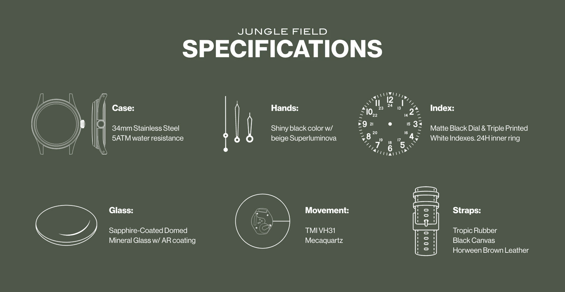 We’ve built the Jungle Field with the necessary tools to honor its collection name as a true field watch. Featuring a Sapphire-coated K1 crystal & 5ATM water resistance, you’ll be able to do pretty much anything with this watch. The 34mm also contributes to reduce the risk of hitting or scratching the watch. As for the movement, we’ve gone with the highly dependable TMM VH31 Meca-quart movement for the best of both worlds. You'll be getting the absolute precision & reliability.