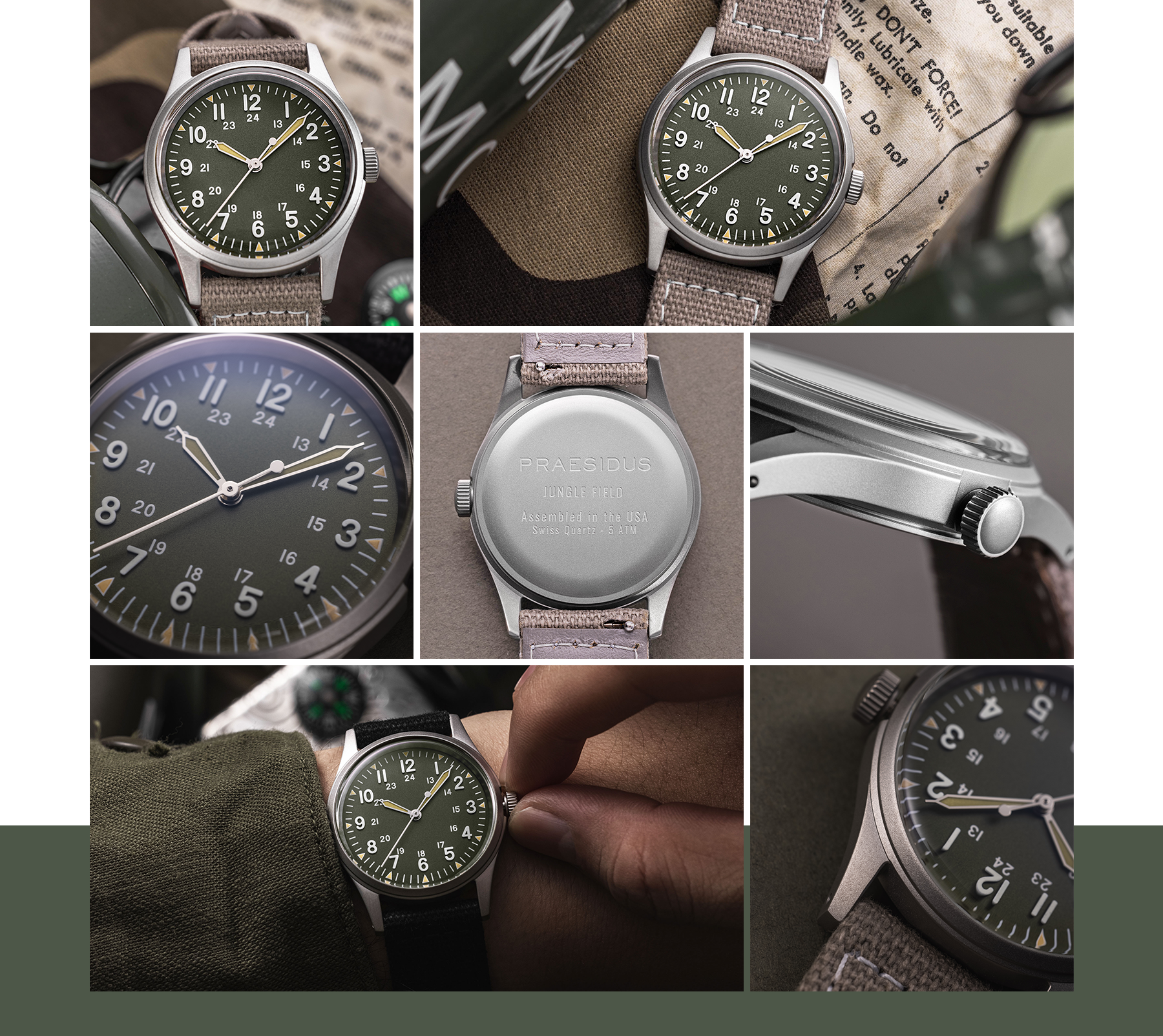 At Praesidus Watch Co. we’re known for playing around with the original sizes of iconic field watch designs. The Jungle Field is no exception to this treatment with its 34mm case diameter. Rather small, its wrist presence is still large specifically because it stands out for its size. Furthermore, the smaller diameter & thin side-profile means the watch will never get in your wrist’s way.
