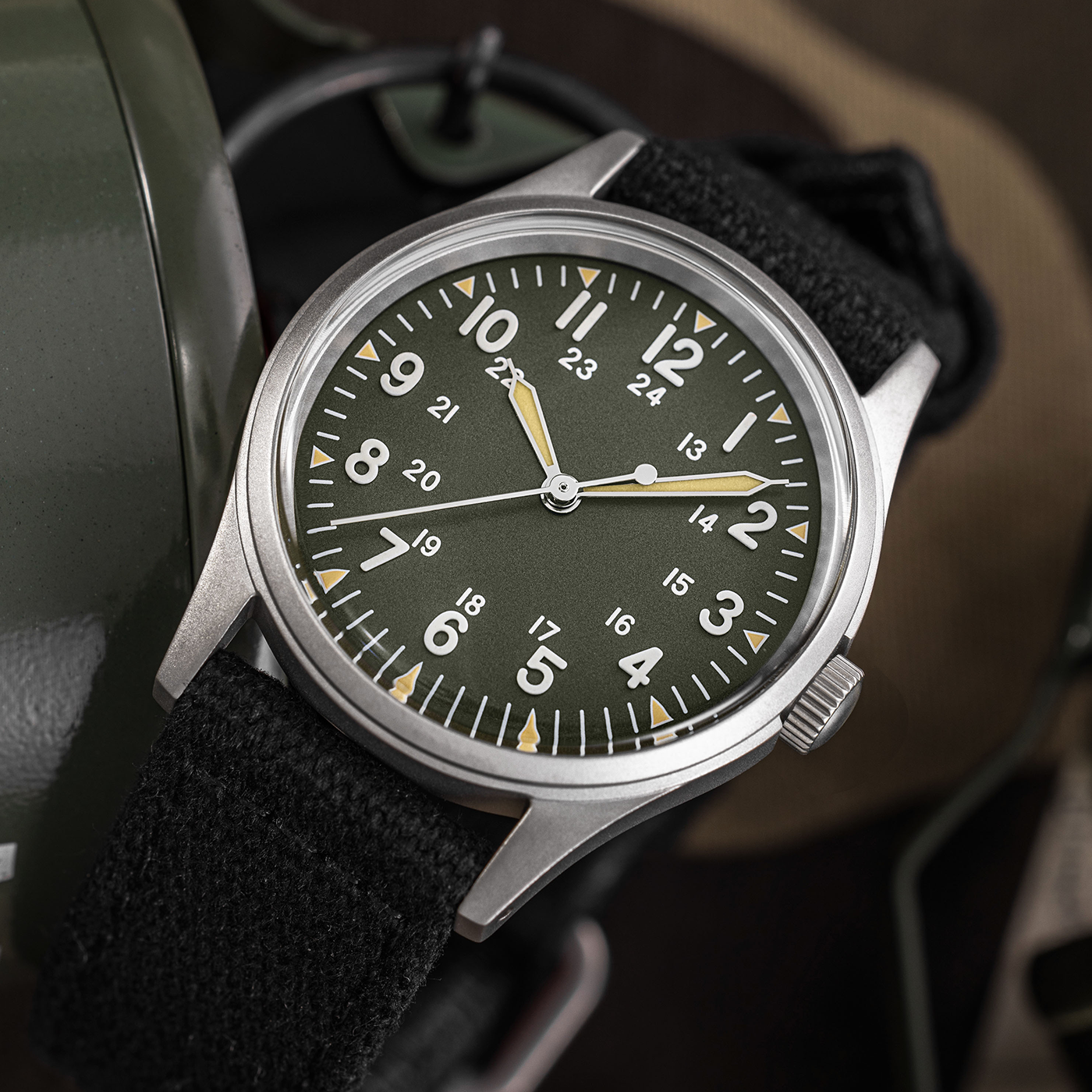 For this limited edition Olive Green dial version, we wanted to pay tribute to the iconic Vietnam Era OG-107 uniform & color. Featuring applied white indexes & patina track-markers, both work together to provide easy legibility despite the smaller 34mm case size. Originally, the GG-W-113 spec required watches to be "parkerized" to reduce shine - we've achieved a similar effect with a strong sandblast on the entirety of the case & caseback.