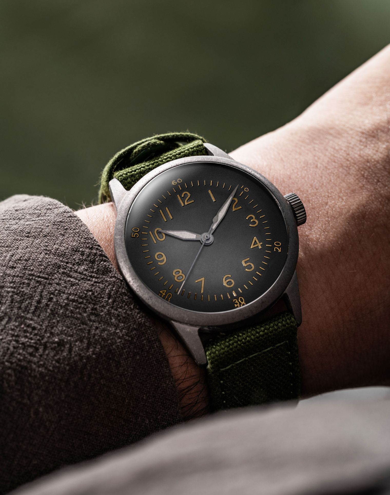 The dial continues this rugged tribute with a black aged finish, specially developed for this release. Indexes are patina’d and subdued, echoing the wear and weathering of real field instruments. No two dials will be exactly the same, each one develops its own character over time.