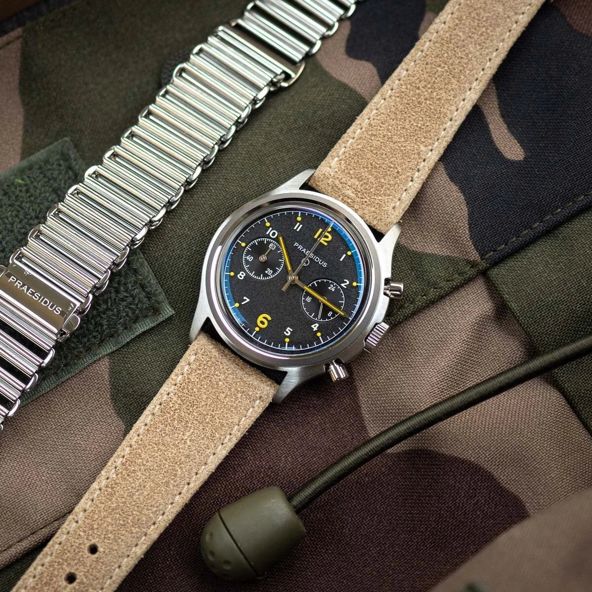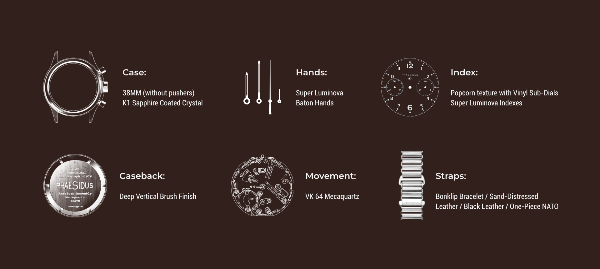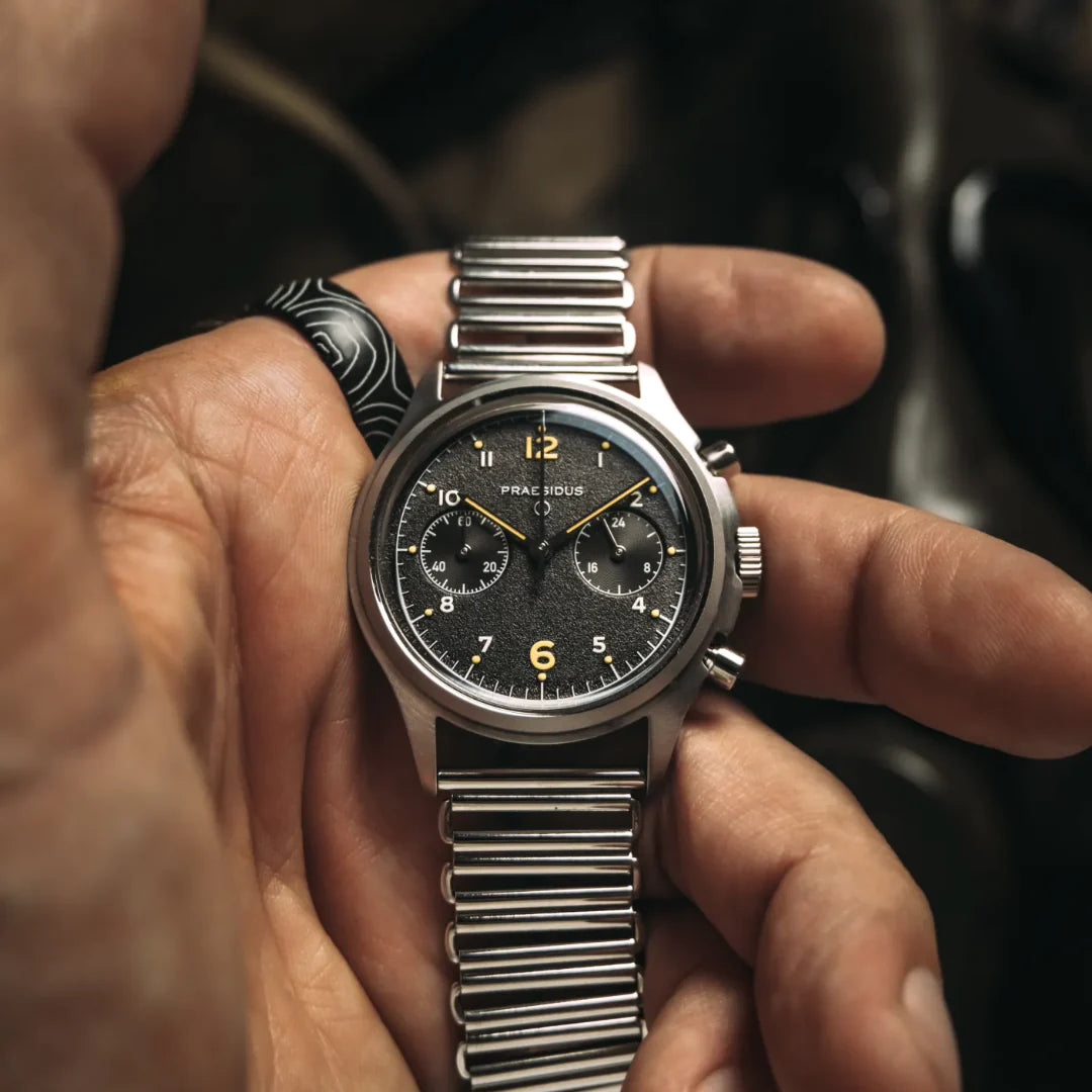 As stated in the collection name, the PAC-76 is a true 70s field chronograph initially designed with absolute functionality in mind. Despite its strong military origins, the PAC-76 is soaked in a 70s aesthetic - who said field watches couldn’t be fashionable? From the oversized 12 & 6 indexes to the funky PRAESIDUS logo on the caseback, you’ll have the look and feel of a watch revived from a bygone golden age of pilot chronographs and innovation.