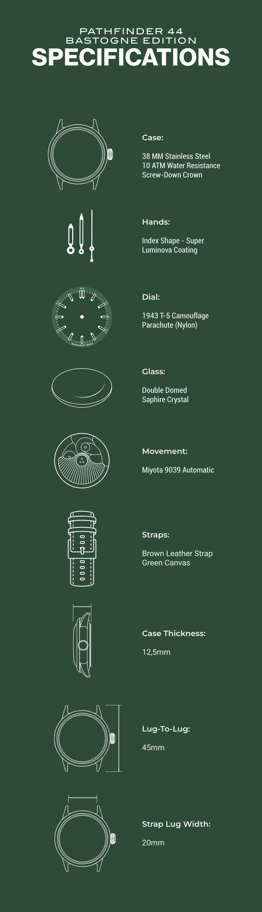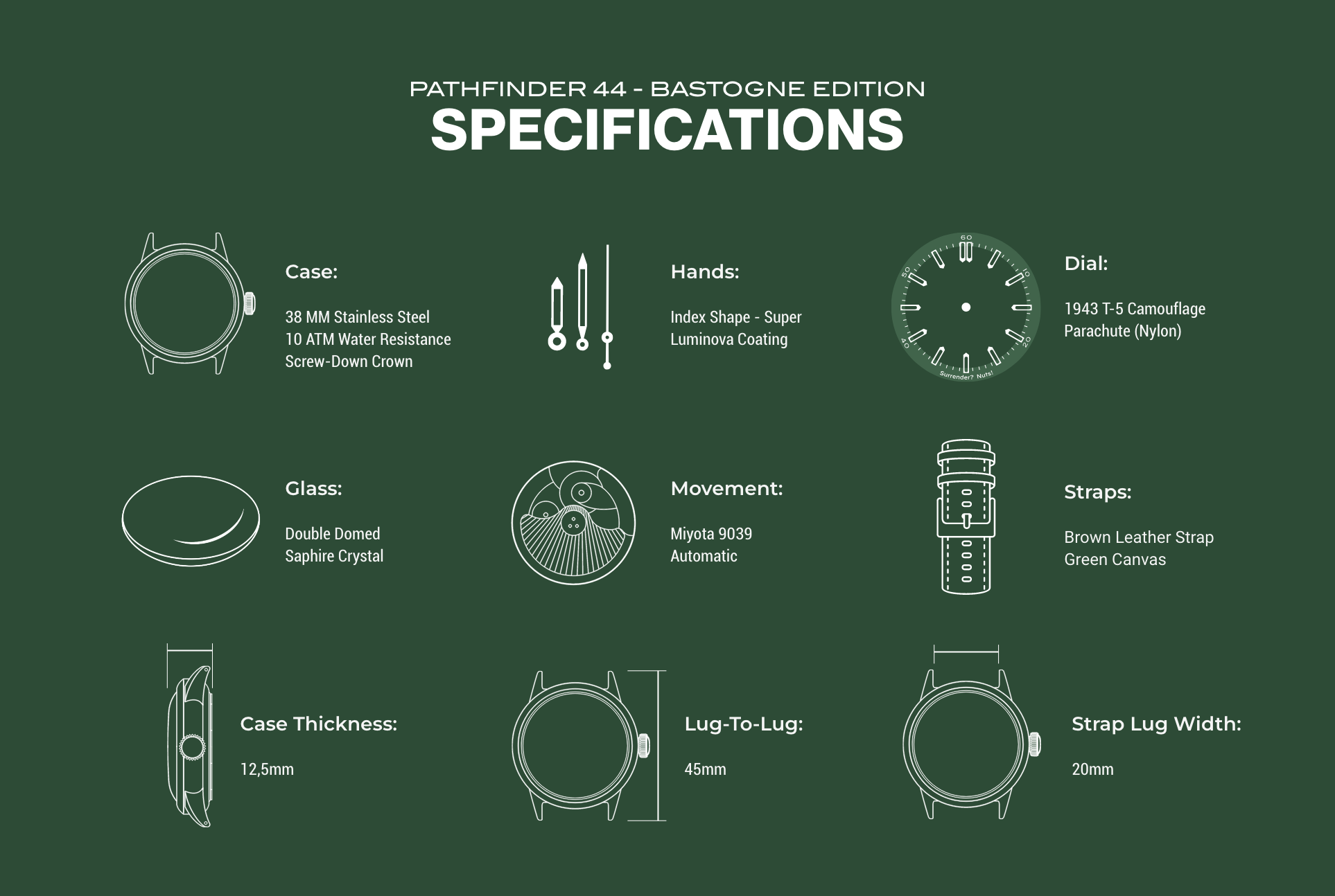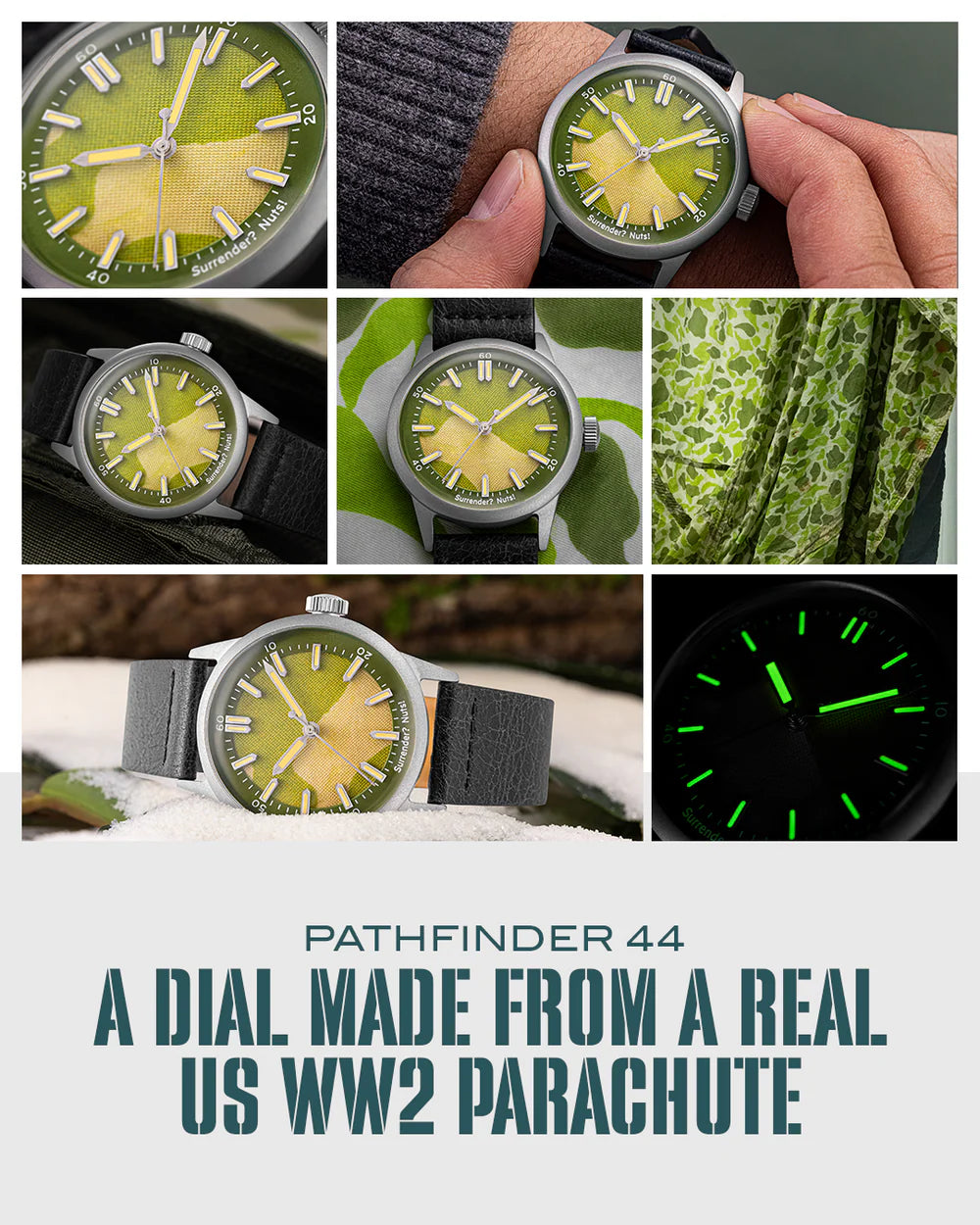 Our first-ever watch, crafted from an actual parachute used during WWII, the Pathfinder 44 incorporates a truly unique piece of camouflage into each dial.