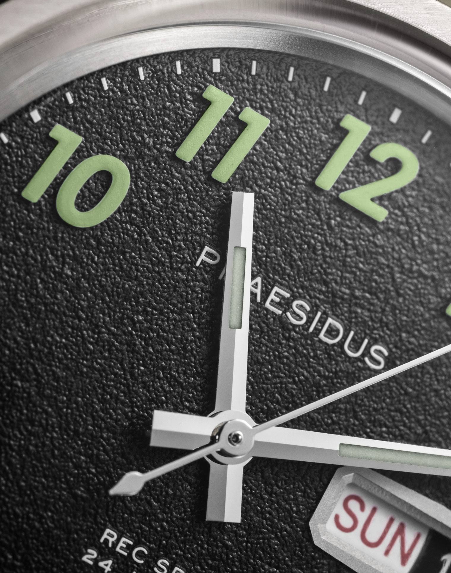 The Rec Spec OG Popcorn is clearly born from the original MACV-SOG watches of the 60s but with a spin. Its shiny-black "popcorn" dial texture provides a striking amount of volume to the overall watch while not over-complexifying the overall legibility. The applied indexes feature a "tritium" style green luminous that calls back to the original radioactive tritium paints used in the 60s on these kinds of watches.