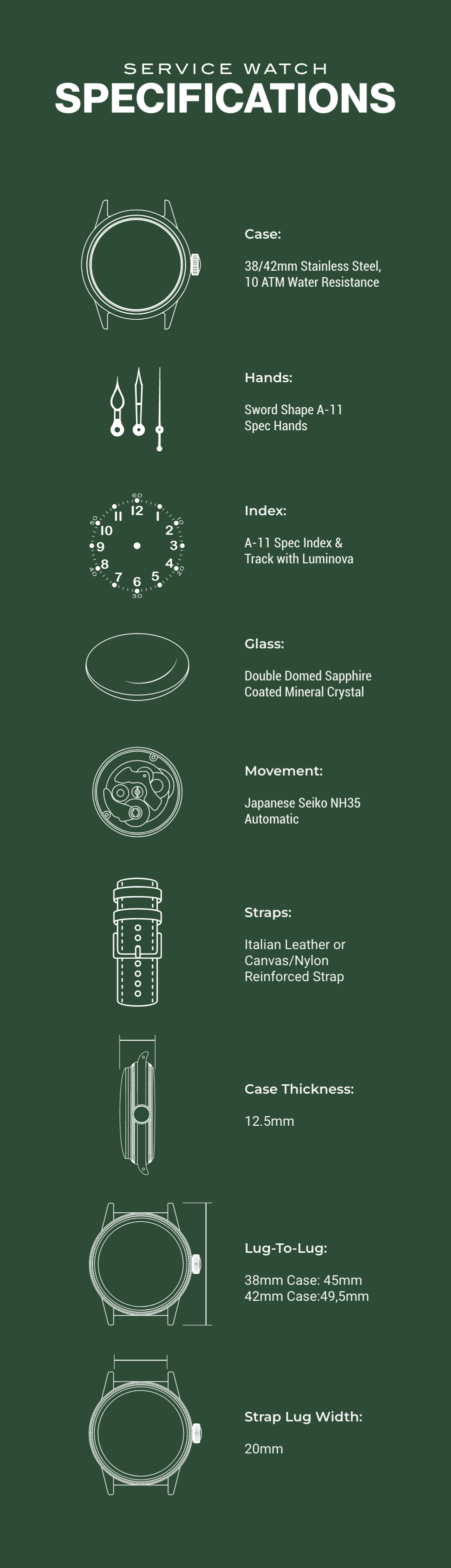 Our A-11 Service Watch has been modernized to improved precision and comfort for the modern day. Its white dial features luminous indexes designed for readability in low-light environments. We've revamped its movement to the rugged TMI NH35 Automatic Movement for great affordability combined with reliability throughout the years. We offer both 38 & 42mm case sizes for easy readability and comfort on the wrist.