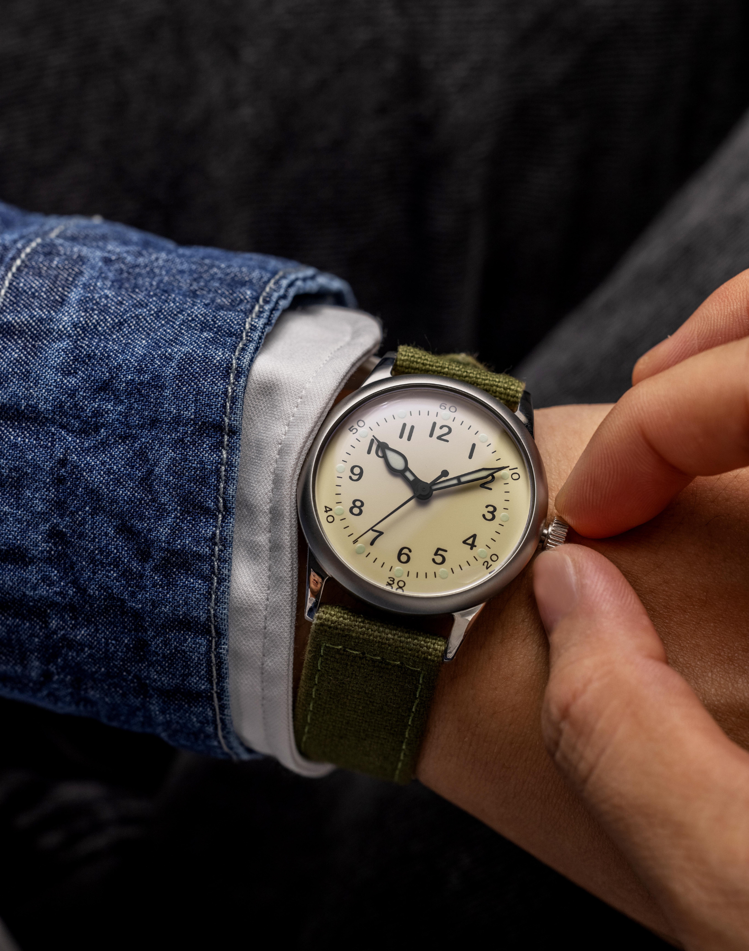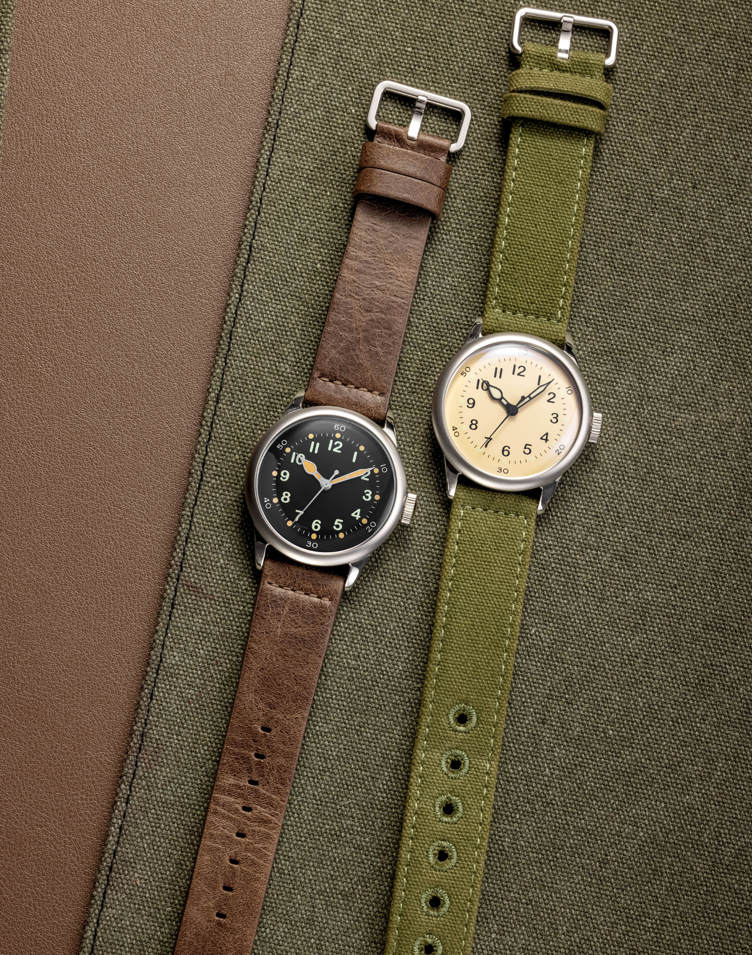 This Service Watch White Dial, Canvas Strap is directly inspired by the A-11 Spec. This watch spec was originally developed in 1942 by the US Military to provide a simple yet efficient timekeeping workhorse for US soldiers.