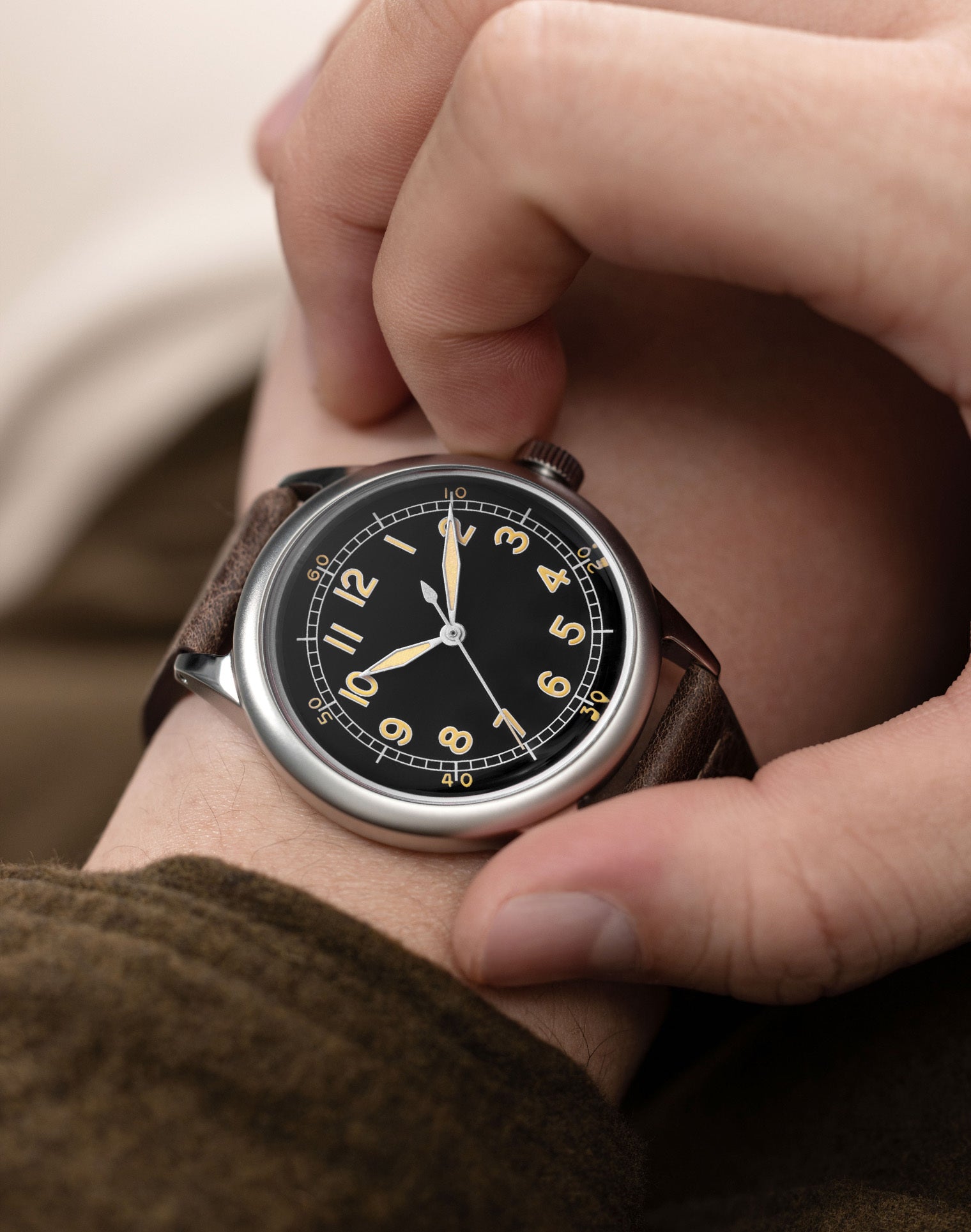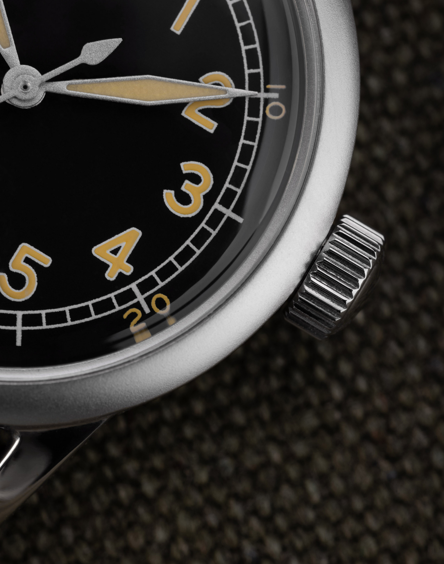 The matte black dial with faux-patina indexes features white contouring to provide superb legibility in all conditions; just like the originals. The funky minute & hour indexes throw back to a time where these watches were literally hand painted. The use of triple-printing on the hour indexes mimics the paint thickness that a 1940s paint brush would have left on the dial. Having traced from an original A-11, the indexes have kept as strong a character as an original would have had.