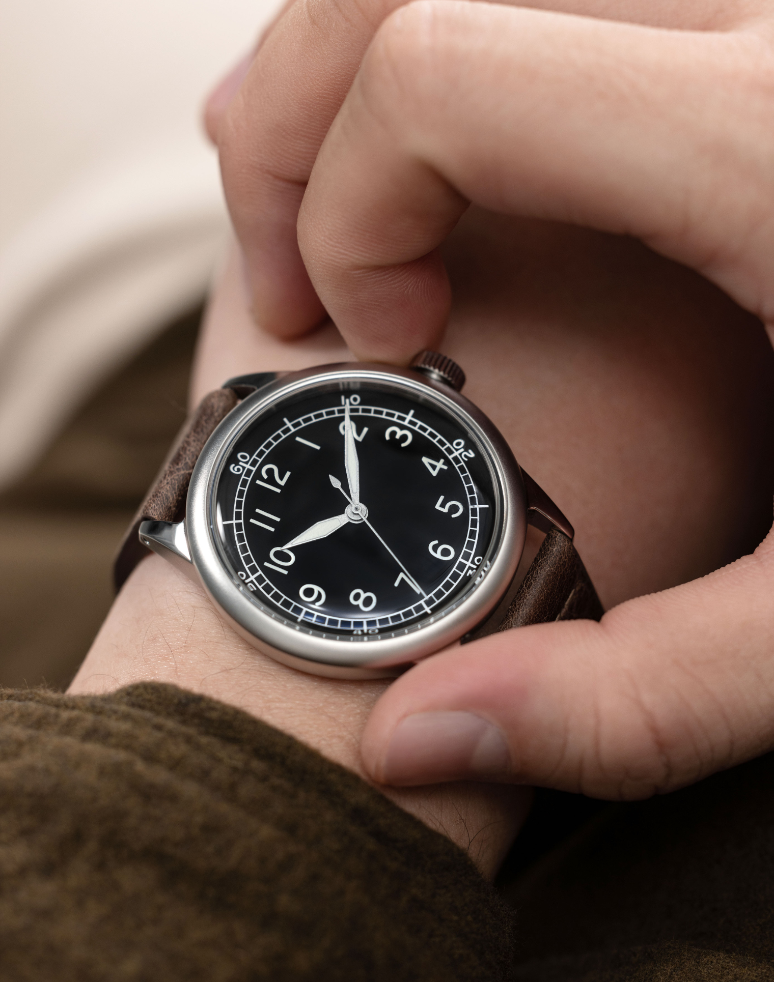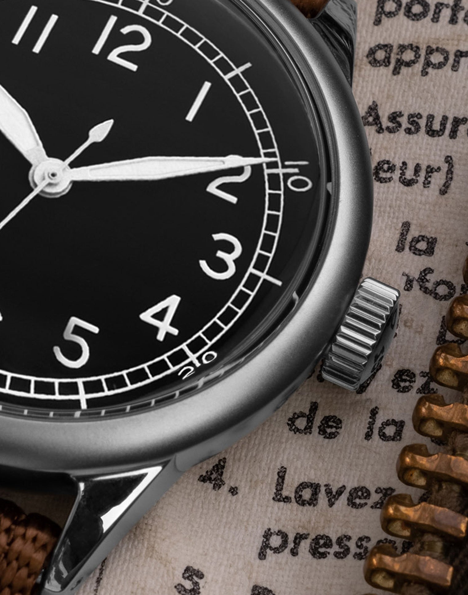 The matte black dial with white-silver indexes provides unparalleled legibility although that is not surprising given the operational requirements back in WW2. The funky minute & hour indexes throw back to a time where these watches were literally hand painted. We've kept all of those micro-faults in this variation to keep the feel of what an original would have been.