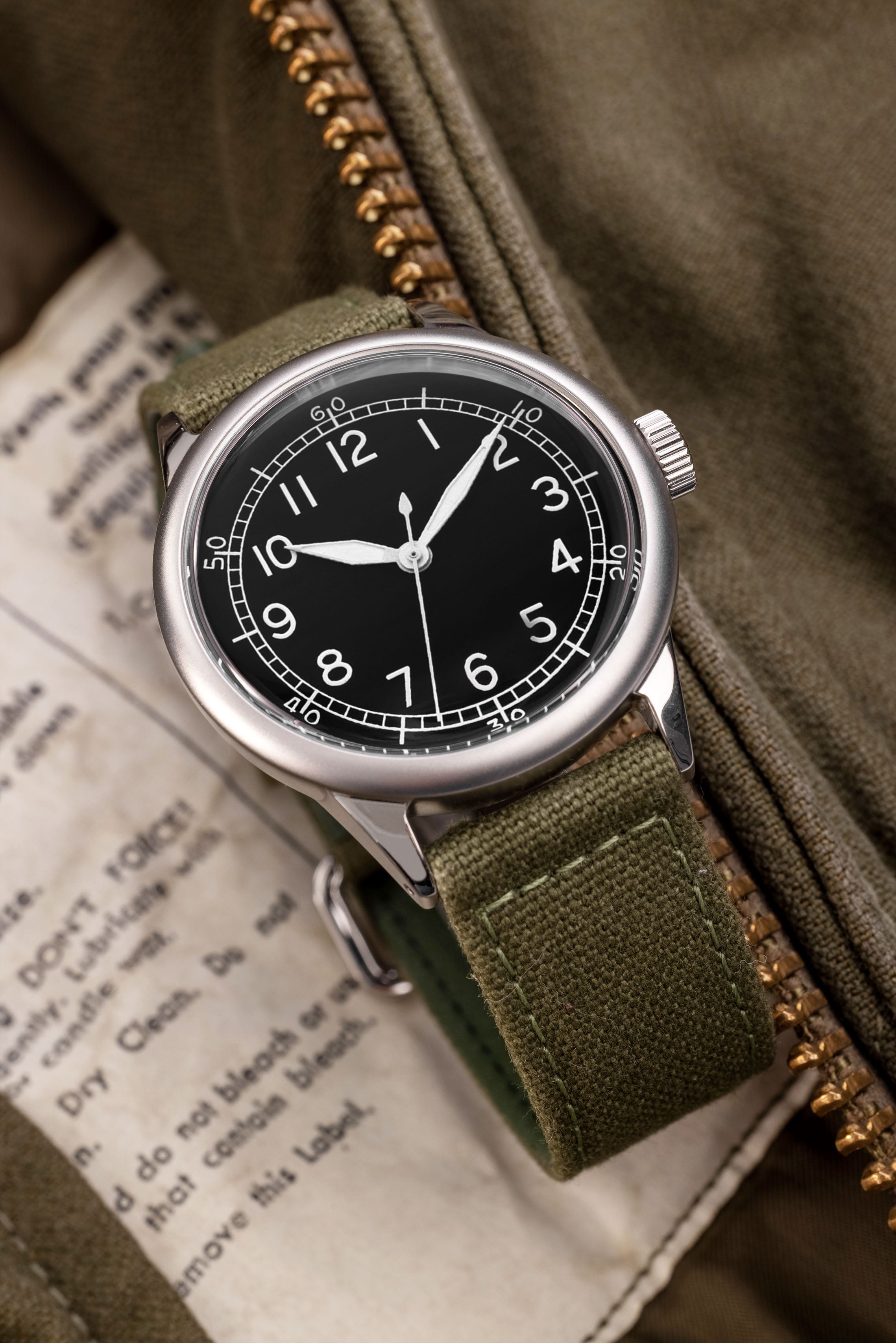 The Drab Green Canvas strap pushes the rest of the watch firmly into Field Watch territory. Built to be thick & tough it makes sense that most US soldiers opted for similar straps when in the field.