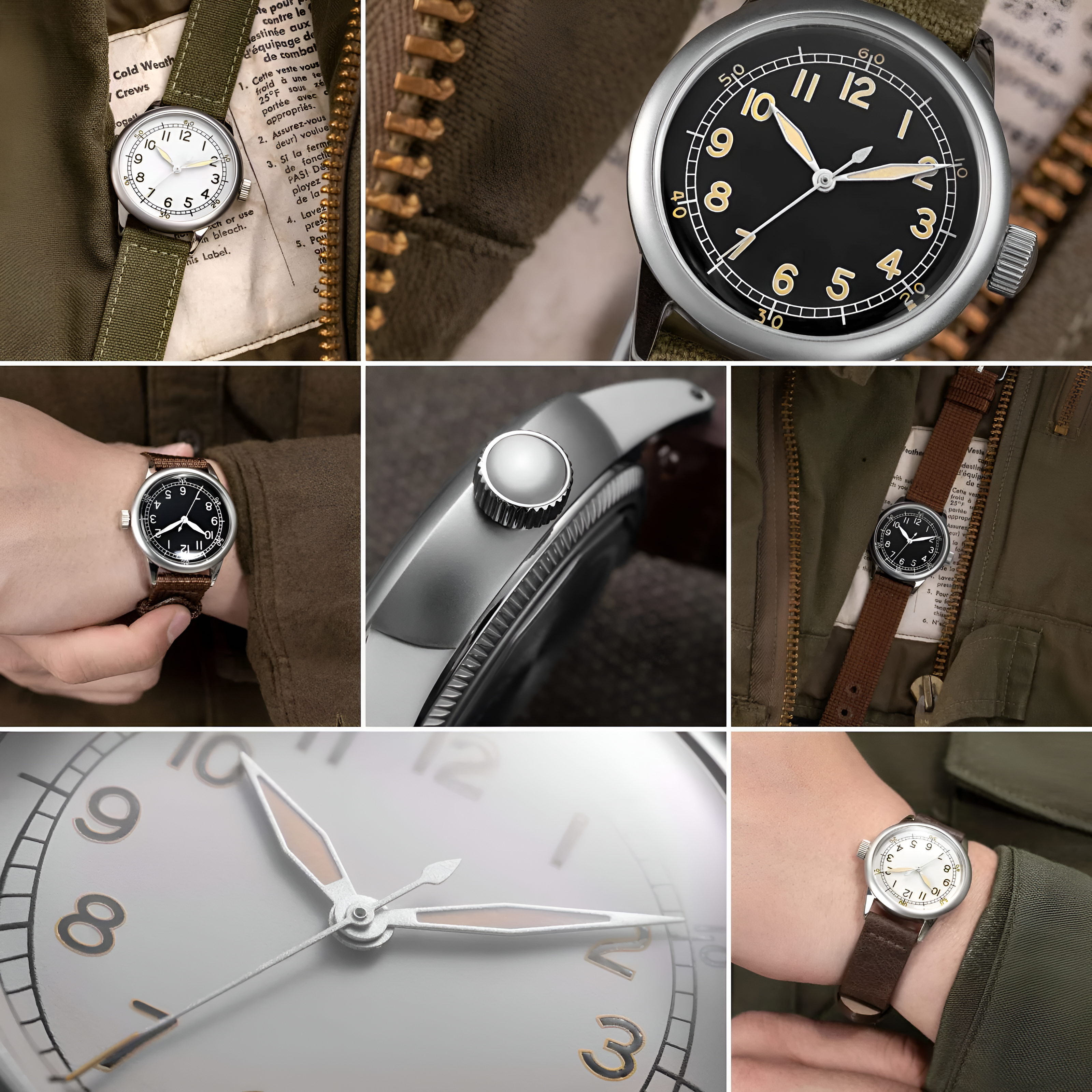 While the dial design in of itself remains resolutely authentic, the clean white dial base with faux-patina contoured black indexes provides a different experience than on our other variants. The funky minute & hour indexes throw back to a time where these watches were literally hand painted. To add onto that, the volume of the triple printed hour indexes mimic the irregularities that a traditional 1940s paint brush would have left on the dial.