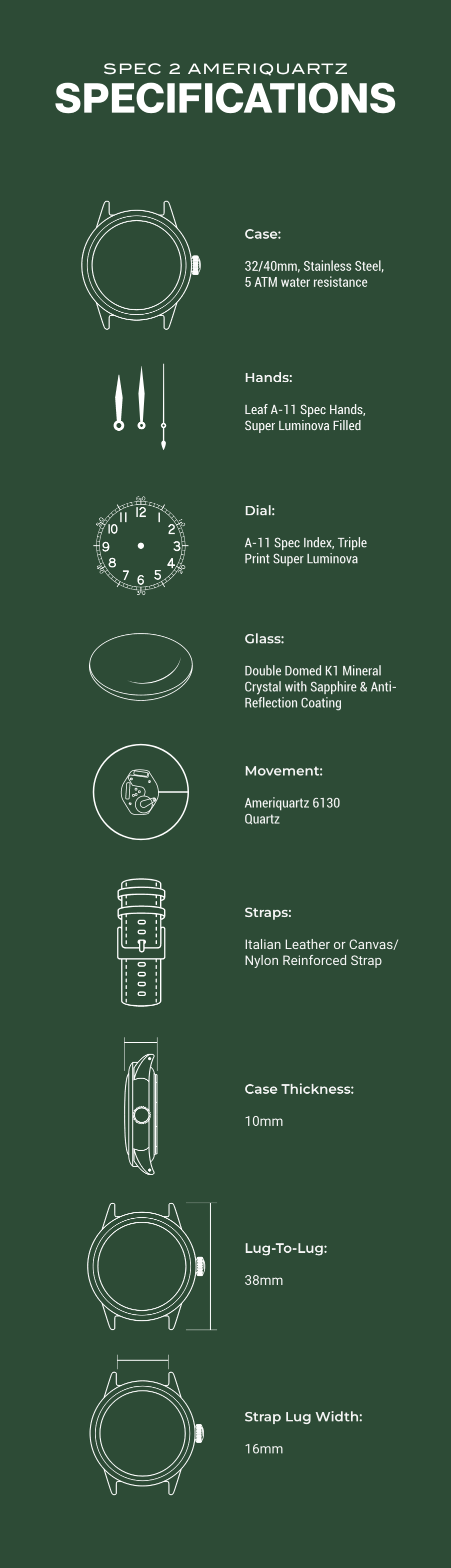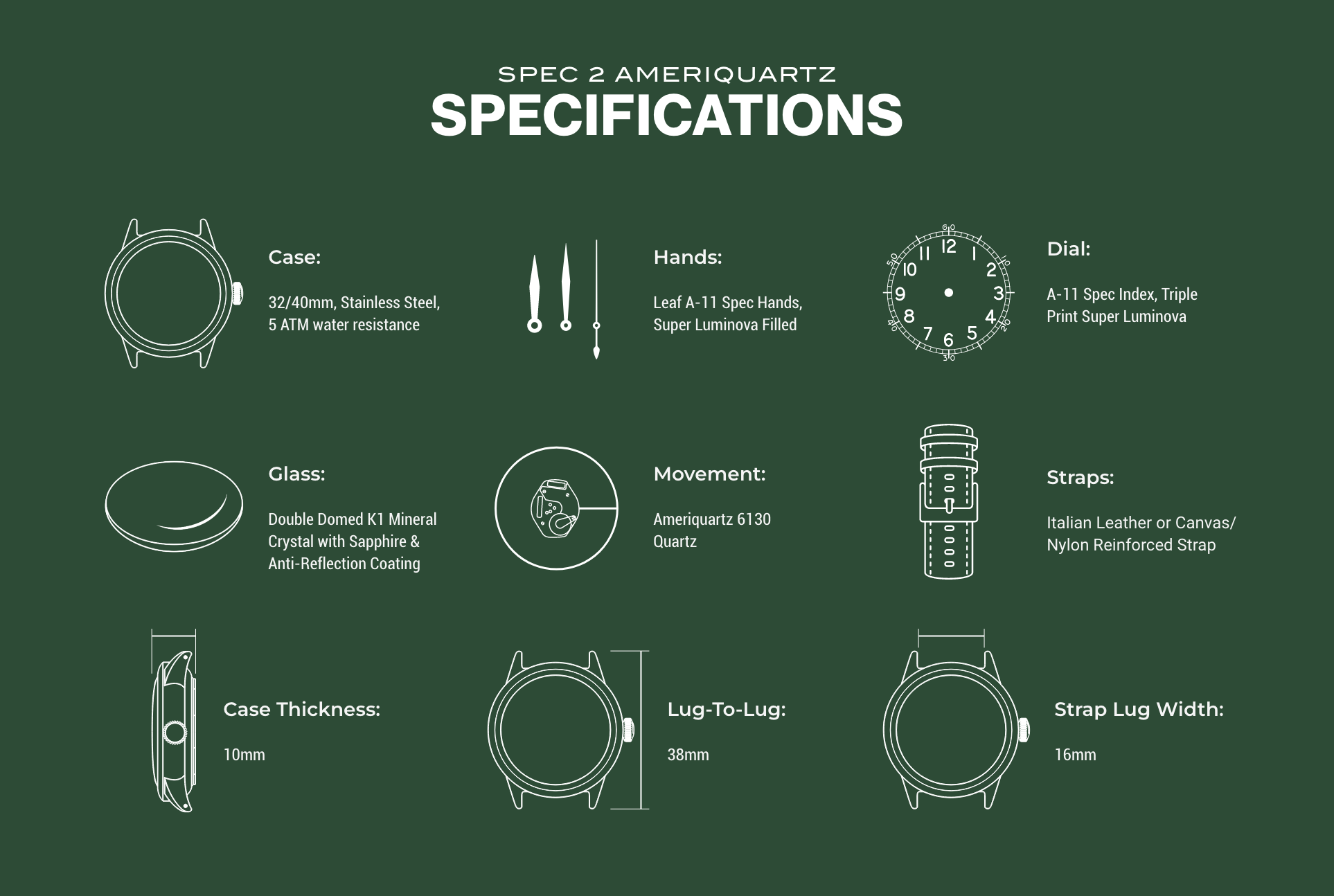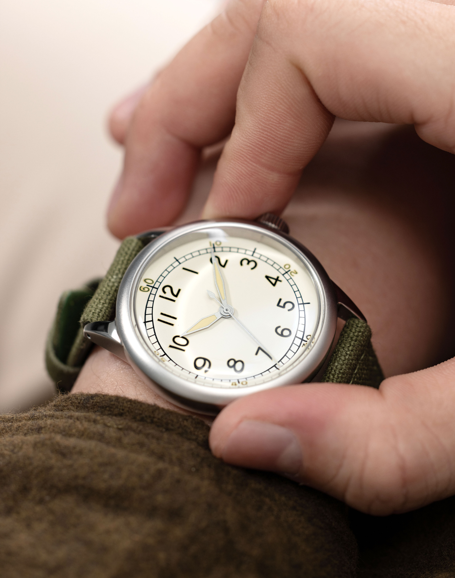 Featuring the most creative dial interpretation of the original A-11 Spec yet, the "White Patina Canvas" carries a reinforced field watch & vintage aesthetic thanks to its Drab Green Canvas Strap. A tried & true military designed material, the canvas adds a strong rugged character to an arguably more refined dial.