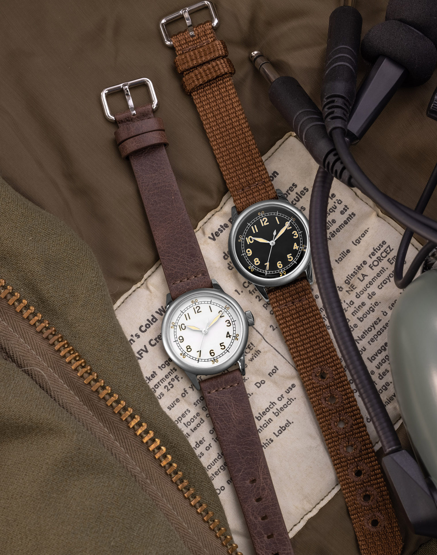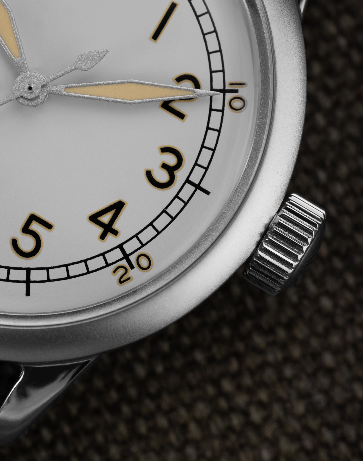 While the dial design in of itself remains resolutely authentic, the clean white dial base with faux-patina contoured black indexes provides a different experience than on our other variants. The funky minute & hour indexes throw back to a time where these watches were literally hand painted. To add onto that, the volume of the triple printed hour indexes mimic the irregularities that a traditional 1940s paint brush would have left on the dial.