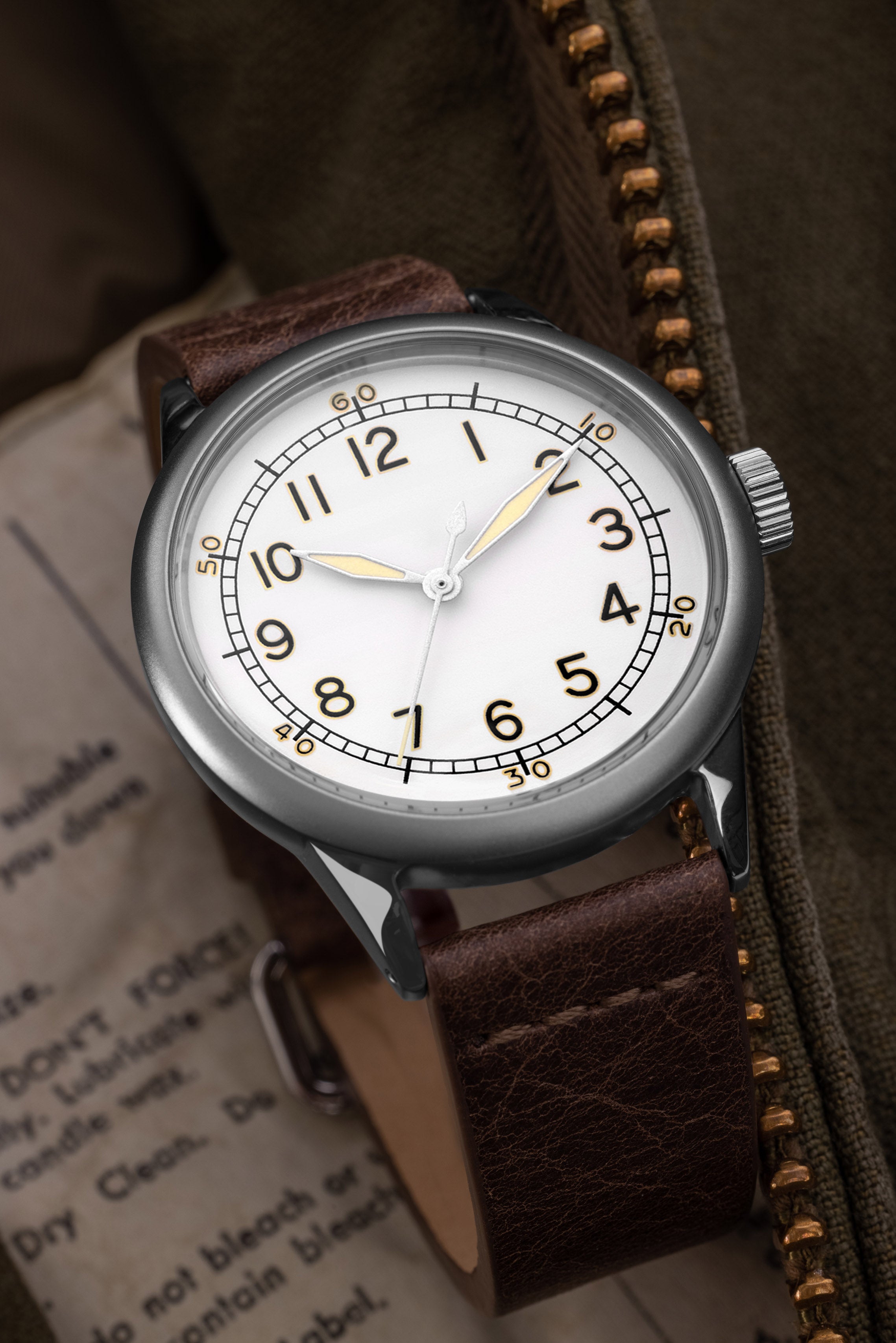 While the dial design in of itself remains resolutely authentic, the clean white dial base with faux-patina contoured black indexes provides a different experience than on our other variants. The funky minute & hour indexes throw back to a time where these watches were literally hand painted. To add onto that, the volume of the triple printed hour indexes mimic the irregularities that a traditional 1940s paint brush would have left on the dial.