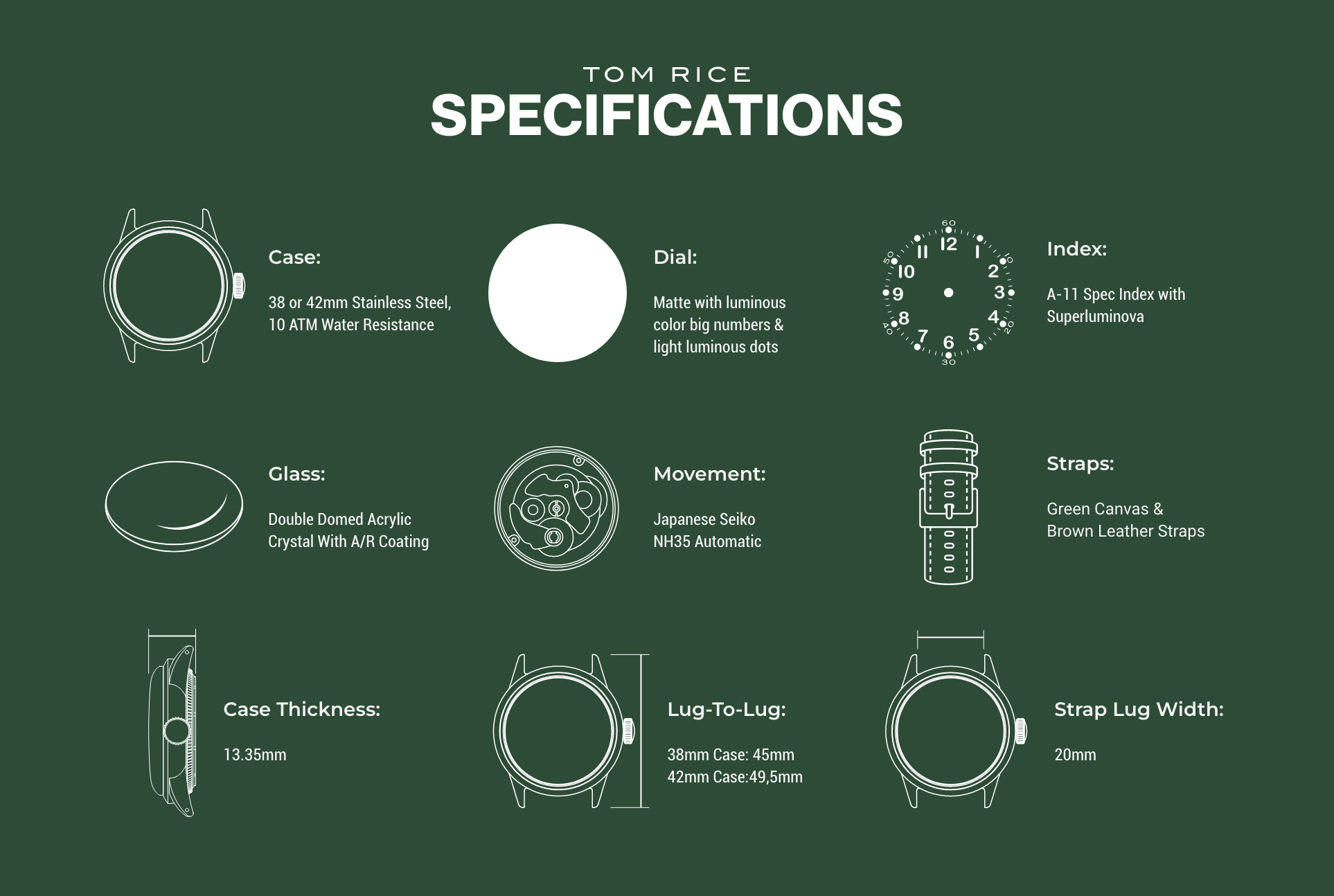 Inspired by the now iconic A-11 watch specification developed by the US Army for watch manufacturers during WW2, our watch is tailor-made to honor the achievements Tom Rice and many men alongside him have fought for on the beaches of Normandy.