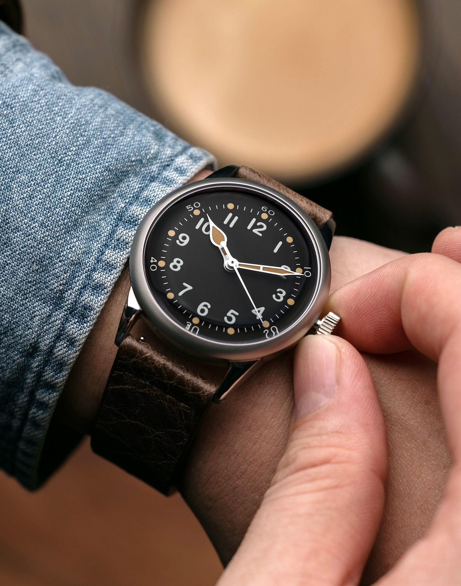 Inspired by the now iconic A-11 watch specification developed by the US Army for watch manufacturers during WW2, our watch is tailor-made to honor the achievements Tom Rice and many men alongside him have fought for on the beaches of Normandy.