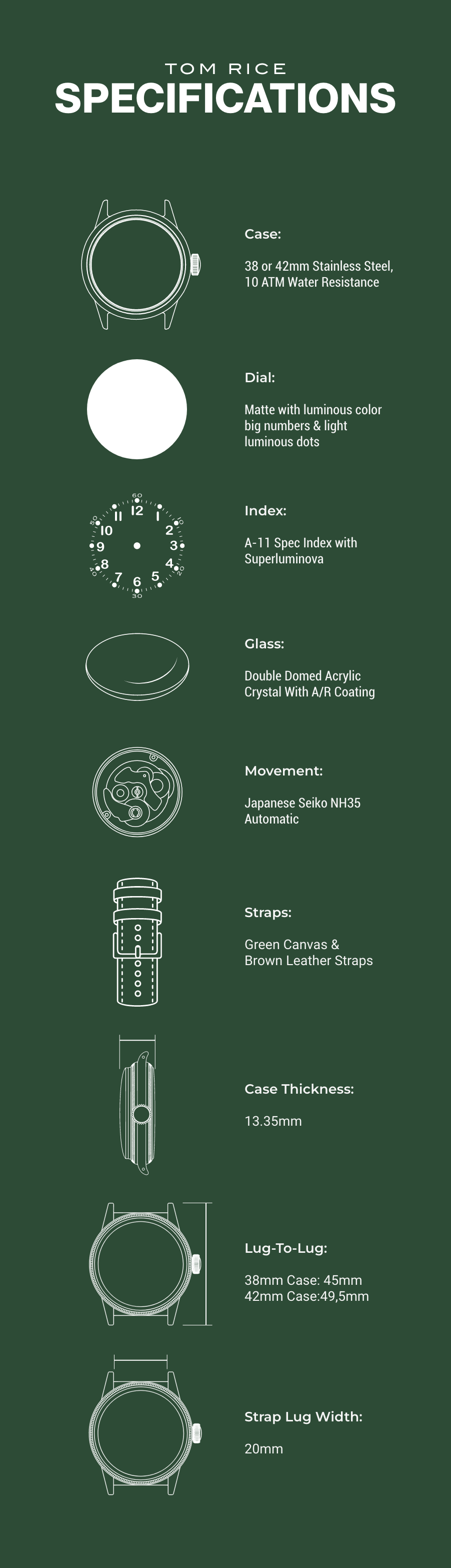 Inspired by the now iconic A-11 watch specification developed by the US Army for watch manufacturers during WW2, our watch is tailor-made to honor the achievements Tom Rice and many men alongside him have fought for on the beaches of Normandy.