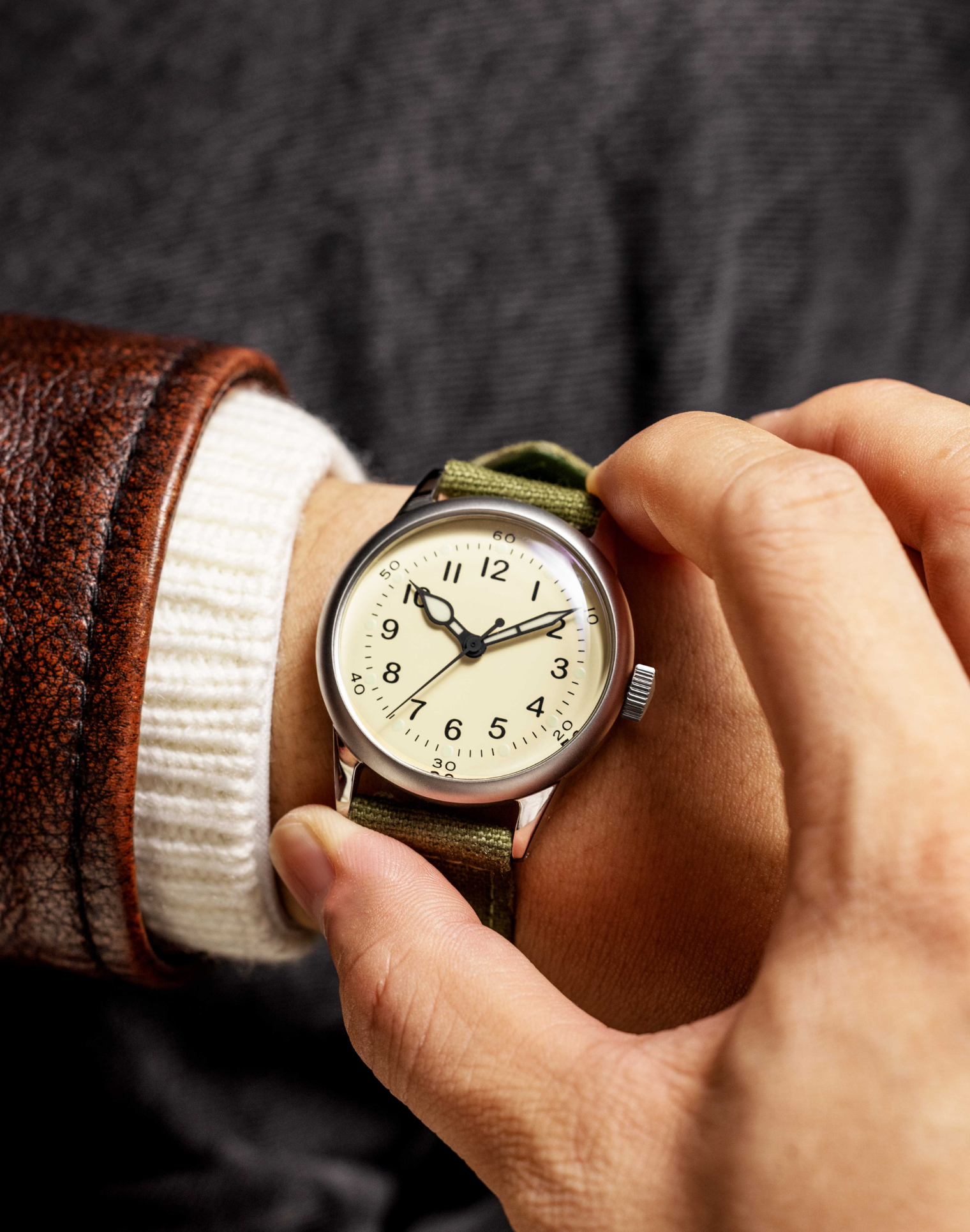 Inspired by the now iconic A-11 watch specification developed by the US Army for watch manufacturers during WW2, our watch is tailor-made to honor the achievements Tom Rice and many men alongside him have fought for on the beaches of Normandy.