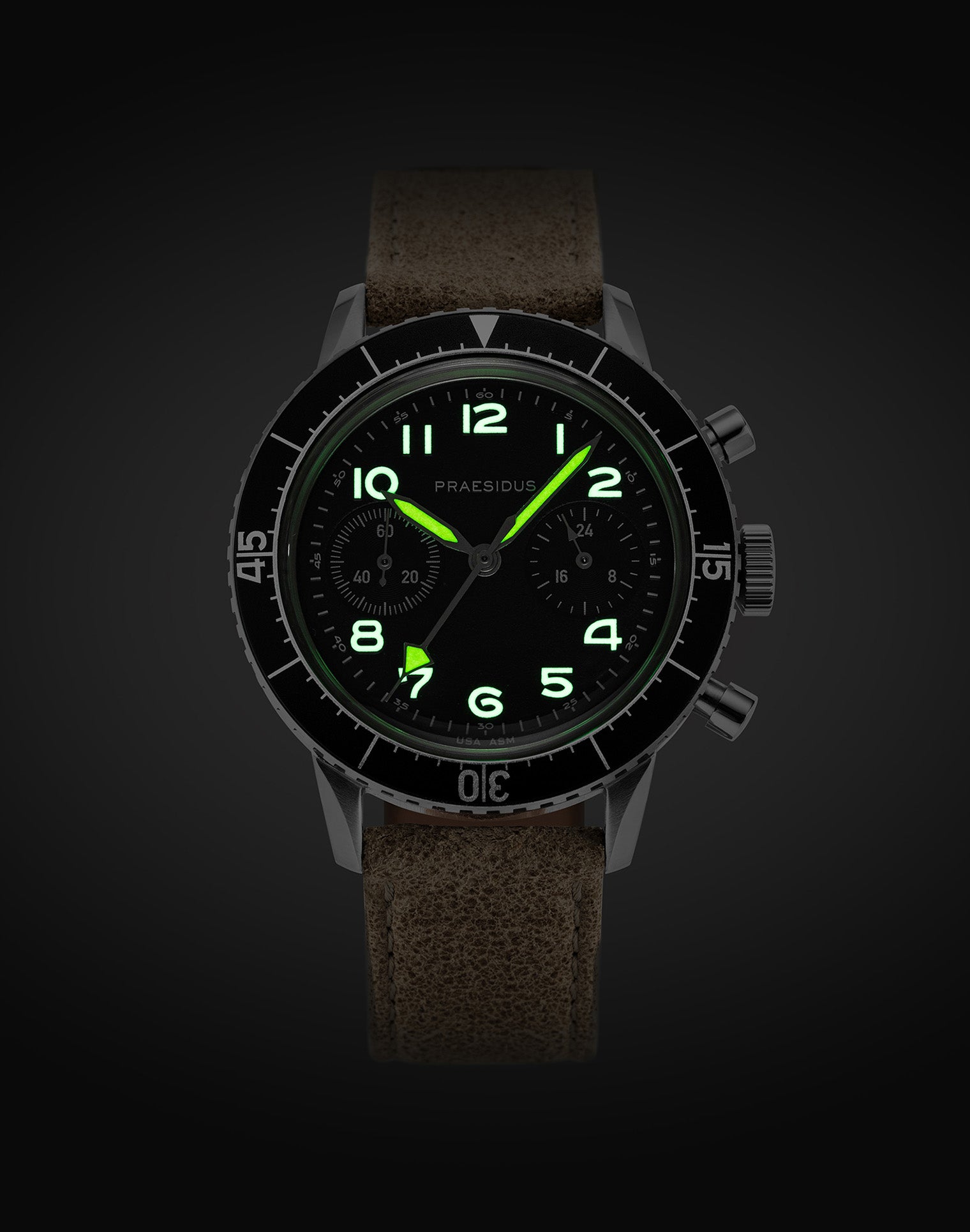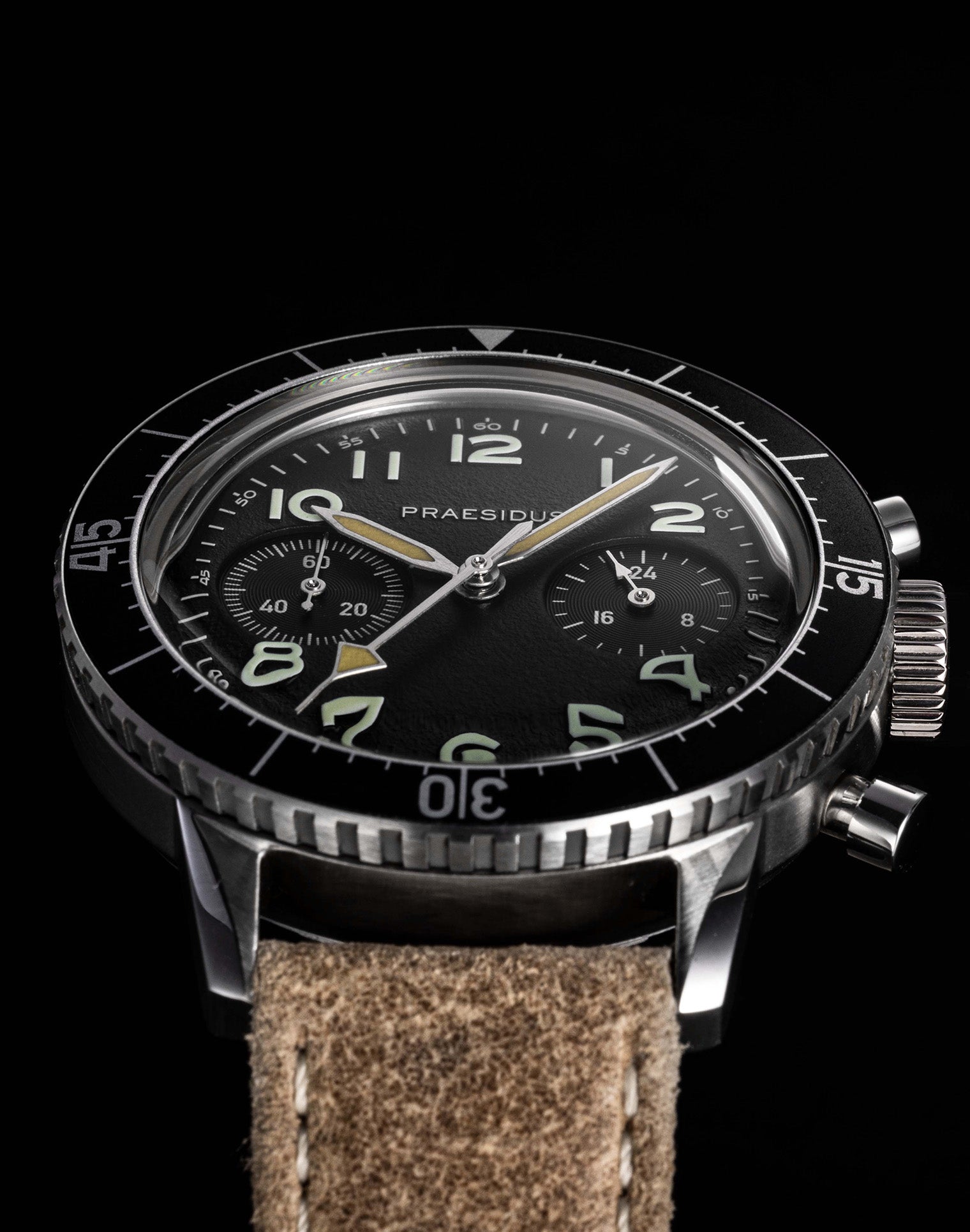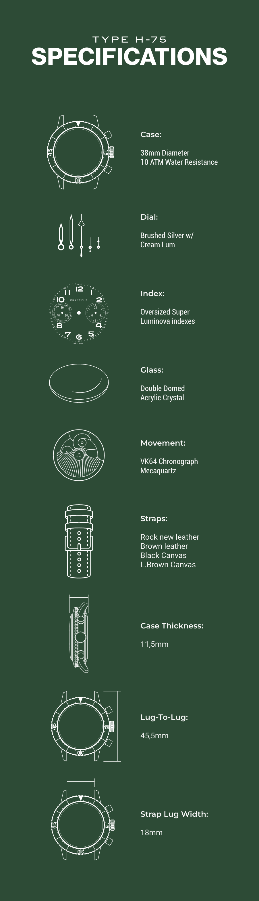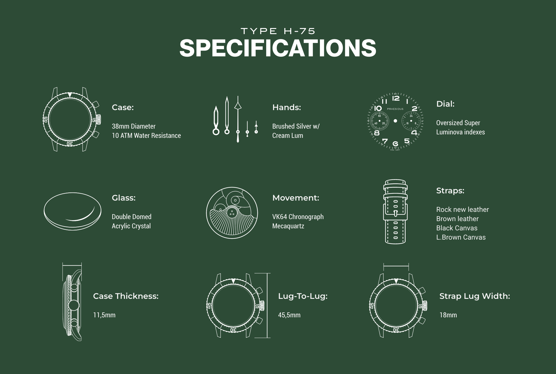 A design originally developed in the 1970s for Italian Helicopter Pilots, the H-75 design bears the mark of a tool watch developed for precision & usability in all field conditions. We’ve brought the original specification requirements to the modern era with added water resistance (10ATM) & a meca-quartz chronograph movement.